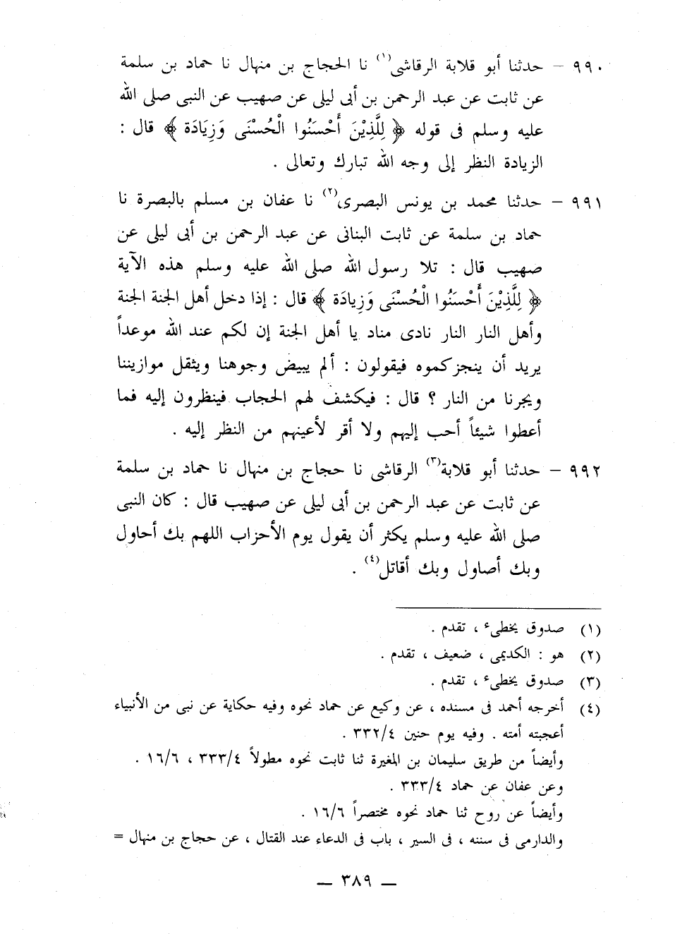 990 - حَدَّثَنَا أَبُو قِلَابَةَ الرَّقَاشِيُّ، نا الْحَجَّاجُ بْنُ مِنْهَالٍ، نا حَمَّادُ بْنُ سَلَمَةَ، عَنْ ثَابِتٍ، عَنْ عَبْدِ الرَّحْمَنِ بْنِ أَبِي لَيْلَى، عَنْ صُهَيْبٍ، عَنِ النَّبِيِّ، صَلَّى اللهُ عَلَيْهِ وَسَلَّمَ، فِي قَوْلِهِ {§لِلَّذِينَ أَحْسَنُوا الْحُسْنَى وَزِيَادَةٌ} [يونس: 26] قَالَ: «الزِّيَادَةُ النَّظَرُ إِلَى وَجْهِ اللَّهِ تَبَارَكَ وَتَعَالَى»