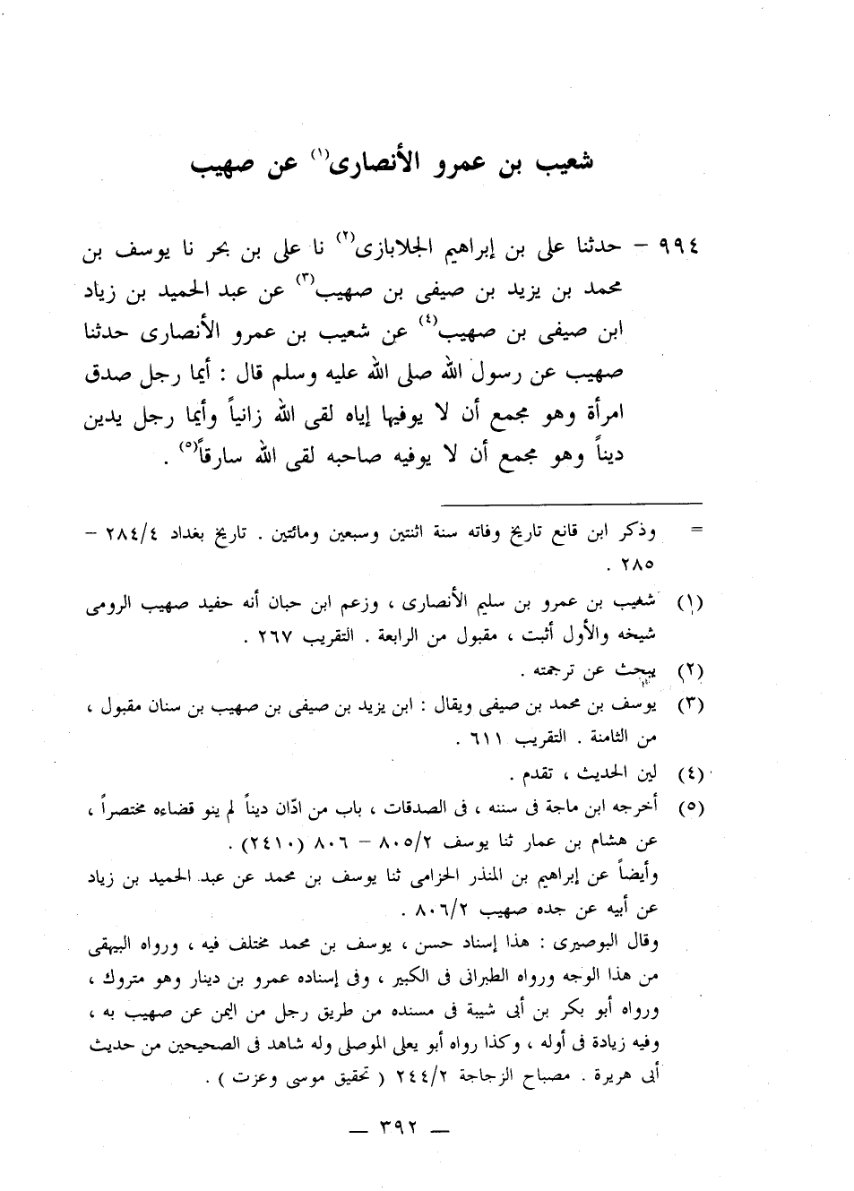 994 - حَدَّثَنَا عَلِيُّ بْنُ إِبْرَاهِيمَ الْجَلَابَازِيُّ، نا عَلِيُّ بْنُ بَحْرٍ، نا يُوسُفُ بْنُ مُحَمَّدِ بْنِ يَزِيدَ بْنِ صَيْفِيِّ بْنِ صُهَيْبٍ، عَنْ عَبْدِ الْحَمِيدِ بْنِ زِيَادِ بْنِ صَيْفِيِّ بْنِ صُهَيْبٍ، عَنْ شُعَيْبِ بْنِ عَمْرٍو الْأَنْصَارِيِّ، حَدَّثَنَا صُهَيْبٌ، عَنْ رَسُولِ اللَّهِ صَلَّى اللهُ عَلَيْهِ وَسَلَّمَ قَالَ: «§أَيُّمَا رَجُلٍ صَدَقَ امْرَأَةً وَهُوَ مُجْمِعٌ أَنْ لَا يُوَفِّيَهَا إِيَّاهُ لَقِيَ اللَّهَ زَانِيًا، وَأَيُّمَا رَجُلٍ يَدِينُ دَيْنًا وَهُوَ مُجْمِعٌ أَنْ لَا يُوَفِّيَهُ صَاحِبَهُ لَقِيَ اللَّهَ سَارِقًا»
