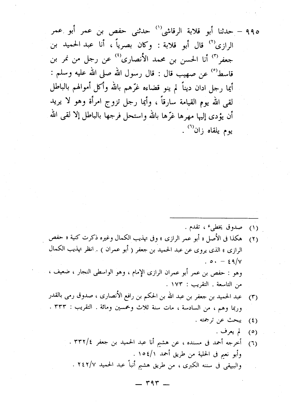 995 - حَدَّثَنَا أَبُو قِلَابَةَ الرَّقَاشِيُّ، حَدَّثَنِي حَفْصُ بْنُ عُمَرَ أَبُو عُمَرَ الرَّازِيُّ، قَالَ أَبُو قِلَابَةَ: وَكَانَ بَصْرِيًّا، أنا عَبْدُ الْحَمِيدِ بْنُ جَعْفَرٍ، أنا الْحَسَنُ بْنُ مُحَمَّدٍ الْأَنْصَارِيُّ، عَنْ رَجُلٍ، مِنْ نَمِرِ بْنِ قَاسِطٍ، عَنْ صُهَيْبٍ قَالَ: قَالَ رَسُولُ اللَّهِ صَلَّى اللهُ عَلَيْهِ وَسَلَّمَ: «§أَيُّمَا رَجُلٍ ادَّانَ دَيْنًا لَمْ يَنْوِ قَضَاءَهُ، غَرَّهُمْ بِاللَّهِ وَأَكَلَ أَمْوَالَهُمْ بِالْبَاطِلِ، لَقِيَ اللَّهَ يَوْمَ الْقِيَامَةِ سَارِقًا، وَأَيُّمَا رَجُلٍ تَزَوَّجَ امْرَأَةً وَهُوَ لَا يُرِيدُ أَنْ يُؤَدِّيَ إِلَيْهَا مَهْرَهَا، غَرَّهَا بِاللَّهِ وَاسْتَحَلَّ فَرْجَهَا بِالْبَاطِلِ، إِلَّا لَقِيَ اللَّهَ يَوْمَ يَلْقَاهُ زَانٍ»