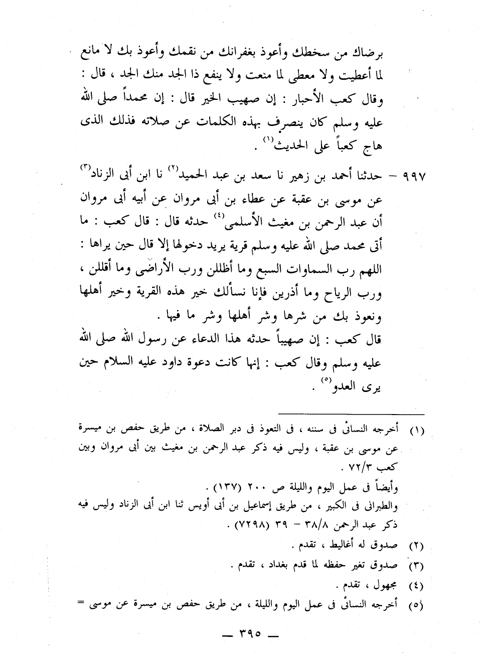 997 - حَدَّثَنَا أَحْمَدُ بْنُ زُهَيْرٍ، نا سَعْدُ بْنُ عَبْدِ الْحَمِيدِ، نا ابْنُ أَبِي الزِّنَادِ، عَنْ مُوسَى بْنِ عُقْبَةَ، عَنْ عَطَاءِ بْنِ أَبِي مَرْوَانَ، عَنْ أَبِيهِ أَبِي مَرْوَانَ، أَنَّ عَبْدَ الرَّحْمَنِ بْنَ مُغِيثٍ الْأَسْلَمِيَّ حَدَّثَهُ قَالَ: قَالَ كَعْبٌ: مَا أَتَى مُحَمَّدٌ صَلَّى اللهُ عَلَيْهِ وَسَلَّمَ قَرْيَةً يُرِيدُ دُخُولَهَا إِلَّا قَالَ حِينَ يَرَاهَا: «§اللَّهُمَّ رَبَّ السَّمَاوَاتِ السَّبْعِ وَمَا أَظْلَلْنَ، وَرَبِّ الْأَرَاضِي وَمَا أَقْلَلْنَ، وَرَبِّ الرِّيَاحِ وَمَا أَذْرَيْنَ، فَإِنَّا نَسْأَلُكَ خَيْرَ هَذِهِ الْقَرْيَةِ وَخَيْرَ أَهْلِهَا، وَنَعُوذُ بِكَ مِنْ شَرِّهَا وَشَرِّ أَهْلِهَا وَشَرِّ مَا فِيهَا» قَالَ كَعْبٌ: إِنَّ صُهَيْبًا حَدَّثَهُ هَذَا الدُّعَاءَ عَنْ رَسُولِ اللَّهِ صَلَّى اللهُ عَلَيْهِ وَسَلَّمَ، وَقَالَ كَعْبٌ: إِنَّهَا كَانَتْ دَعْوَةَ دَاوُدَ عَلَيْهِ السَّلَامُ حِينَ يَرَى الْعَدُوَّ