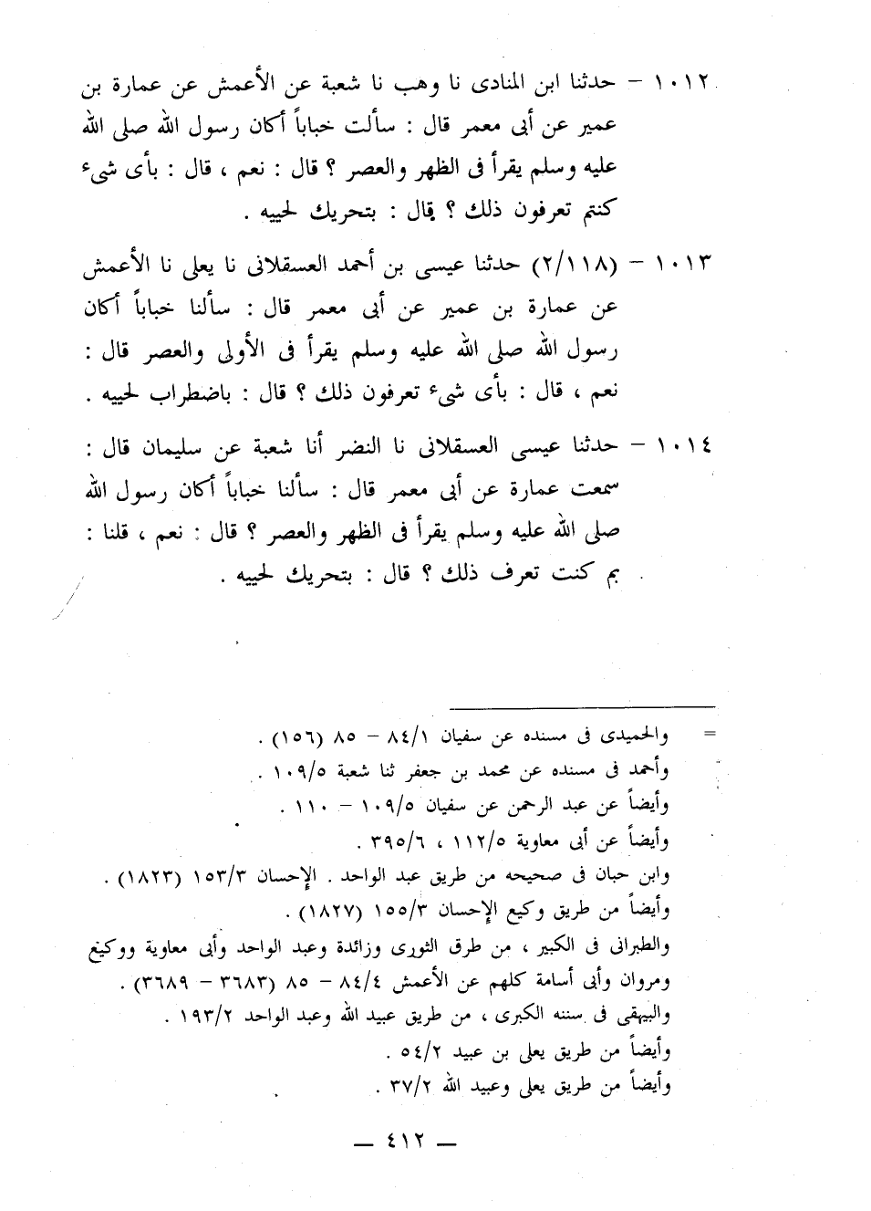 1014 - حَدَّثَنَا عِيسَى الْعَسْقَلَانِيُّ، نا النَّضْرُ، أنا شُعْبَةُ، عَنْ سُلَيْمَانَ قَالَ: سَمِعْتُ عُمَارَةَ، عَنْ أَبِي مَعْمَرٍ قَالَ: سَأَلْنَا خَبَّابًا، أَكَانَ رَسُولُ اللَّهِ صَلَّى اللهُ عَلَيْهِ وَسَلَّمَ §يَقْرَأُ فِي الظُّهْرِ وَالْعَصْرِ؟ قَالَ: نَعَمْ، قُلْنَا: بِمَ كُنْتَ تَعْرِفُ ذَلِكَ؟ قَالَ: بِتَحْرِيكِ لَحْيَيْهِ