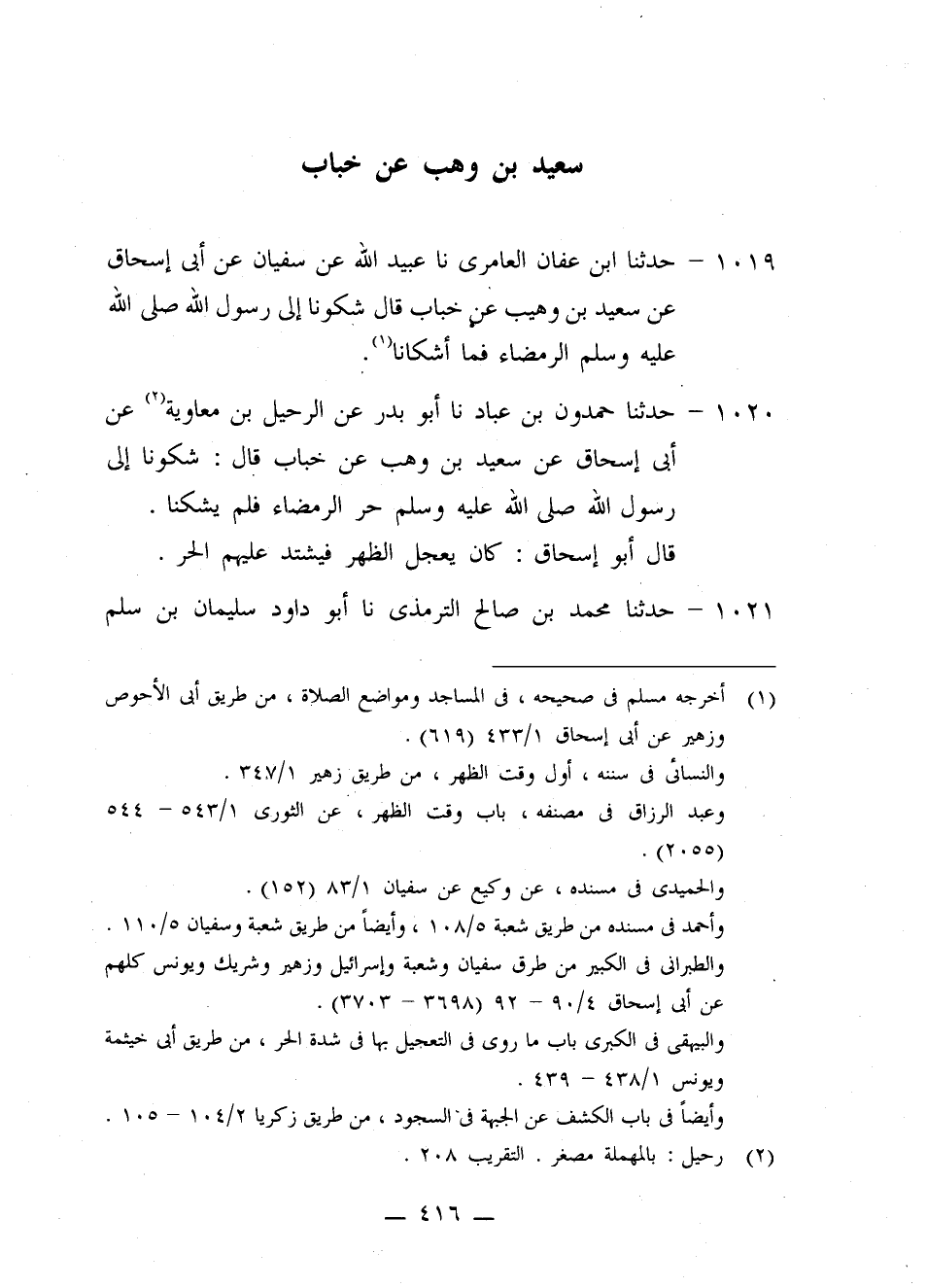 1020 - حَدَّثَنَا حَمْدُونُ بْنُ عَبَّادٍ، نا أَبُو بَدْرٍ، عَنِ الرُّحَيْلِ بْنِ مُعَاوِيَةَ، عَنْ أَبِي إِسْحَاقَ، عَنْ سَعِيدِ بْنِ وَهْبٍ، عَنْ خَبَّابٍ قَالَ: «§شَكَوْنَا إِلَى رَسُولِ اللَّهِ صَلَّى اللهُ عَلَيْهِ وَسَلَّمَ حَرَّ الرَّمْضَاءِ فَلَمْ يُشْكِنَا» قَالَ أَبُو إِسْحَاقَ: كَانَ يُعَجِّلُ الظُّهْرَ فَيَشْتَدُّ عَلَيْهِمُ الْحَرُّ