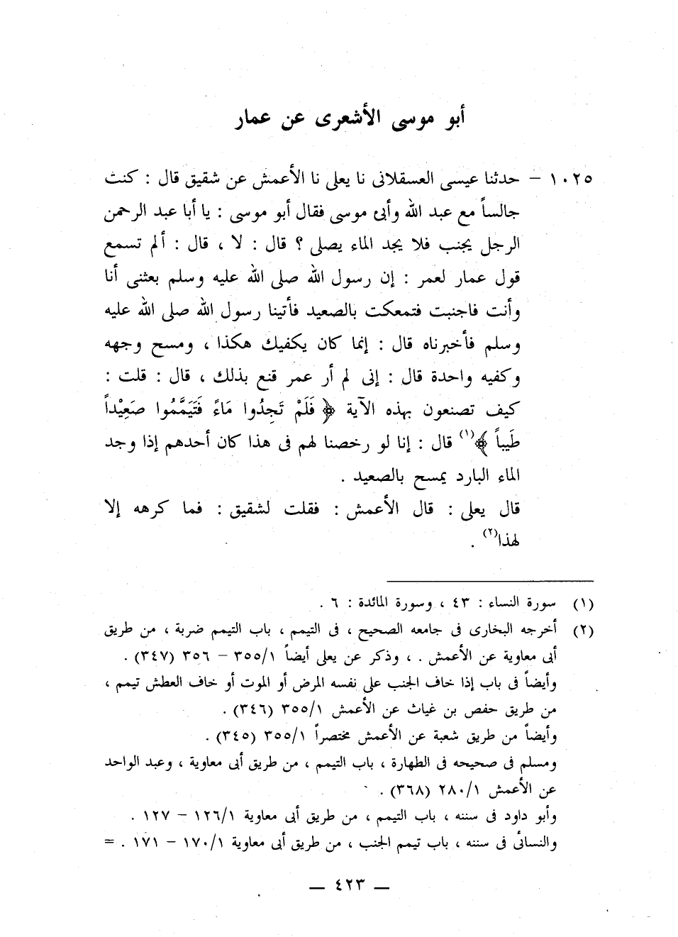 1025 - حَدَّثَنَا عِيسَى الْعَسْقَلَانِيُّ، نا يَعْلَى، نا الْأَعْمَشُ، عَنْ شَقِيقٍ قَالَ: كُنْتُ جَالِسًا مَعَ عَبْدِ اللَّهِ وَأَبِي مُوسَى، فَقَالَ أَبُو مُوسَى: يَا أَبَا عَبْدِ الرَّحْمَنِ: الرَّجُلُ يُجْنِبُ فَلَا يَجِدُ الْمَاءَ يُصَلِّي؟ قَالَ: لَا قَالَ: أَلَمْ تَسْمَعْ قَوْلَ عَمَّارٍ لِعُمَرَ: إِنَّ رَسُولَ اللَّهِ صَلَّى اللهُ عَلَيْهِ وَسَلَّمَ بَعَثَنِي أَنَا وَأَنْتَ فَأَجْنَبْتُ فَتَمَعَّكْتُ بِالصَّعِيدِ، فَأَتَيْنَا رَسُولَ اللَّهِ صَلَّى اللهُ عَلَيْهِ وَسَلَّمَ فَأَخْبَرْنَاهُ قَالَ: «§إِنَّمَا كَانَ يَكْفِيكَ هَكَذَا، وَمَسَحَ وَجْهَهُ وَكَفَّيْهِ وَاحِدَةً» . قَالَ: إِنِّي لَمْ أَرَ عُمَرَ قَنِعَ بِذَلِكَ قَالَ: قُلْتُ: كَيْفَ تَصْنَعُونَ بِهَذِهِ الْآيَةِ {فَلَمْ تَجِدُوا مَاءً فَتَيَمَّمُوا صَعِيدًا طَيِّبًا} [النساء: 43] ؟ قَالَ: إِنَّا لَوْ رَخَّصْنَا لَهُمْ فِي هَذَا كَانَ أَحَدُهُمْ إِذَا وَجَدَ الْمَاءَ الْبَارِدَ يَمْسَحُ بِالصَّعِيدِ قَالَ يَعْلَى: قَالَ الْأَعْمَشُ: فَقُلْتُ لِشَقِيقٍ: فَمَا كَرِهَهُ إِلَّا لِهَذَا