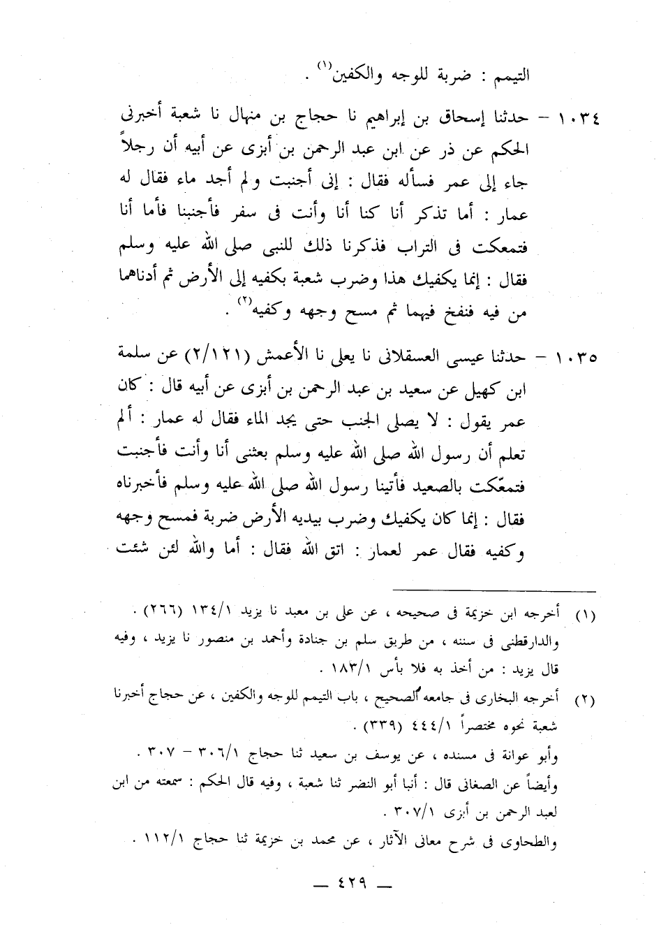 1034 - حَدَّثَنَا إِسْحَاقُ بْنُ إِبْرَاهِيمَ، نا حَجَّاجُ بْنُ مِنْهَالٍ، نا شُعْبَةُ، أَخْبَرَنِي الْحَكَمُ، عَنْ ذَرٍّ، عَنِ ابْنِ عَبْدِ الرَّحْمَنِ بْنِ أَبْزَى، عَنْ أَبِيهِ، أَنَّ رَجُلًا جَاءَ إِلَى عُمَرَ، فَسَأَلَهُ فَقَالَ: إِنِّي أَجْنَبْتُ وَلَمْ أَجِدْ مَاءً، فَقَالَ لَهُ عَمَّارٌ: أَمَا تَذْكُرُ أَنَّا §كُنَّا أَنَا وَأَنْتَ فِي سَفَرٍ فَأَجْنَبْنَا، فَأَمَّا أَنَا فَتَمَعَّكْتُ فِي التُّرَابِ، فَذَكَرْنَا ذَلِكَ لِلنَّبِيِّ صَلَّى اللهُ عَلَيْهِ وَسَلَّمَ، فَقَالَ: «إِنَّمَا يَكْفِيكَ هَذَا» ، وَضَرَبَ شُعْبَةُ بِكَفَّيْهِ إِلَى الْأَرْضِ، ثُمَّ أَدْنَاهُمَا مِنْ فِيهِ فَنَفَخَ فِيهِمَا، ثُمَّ مَسَحَ وَجْهَهُ وَكَفَّيْهِ