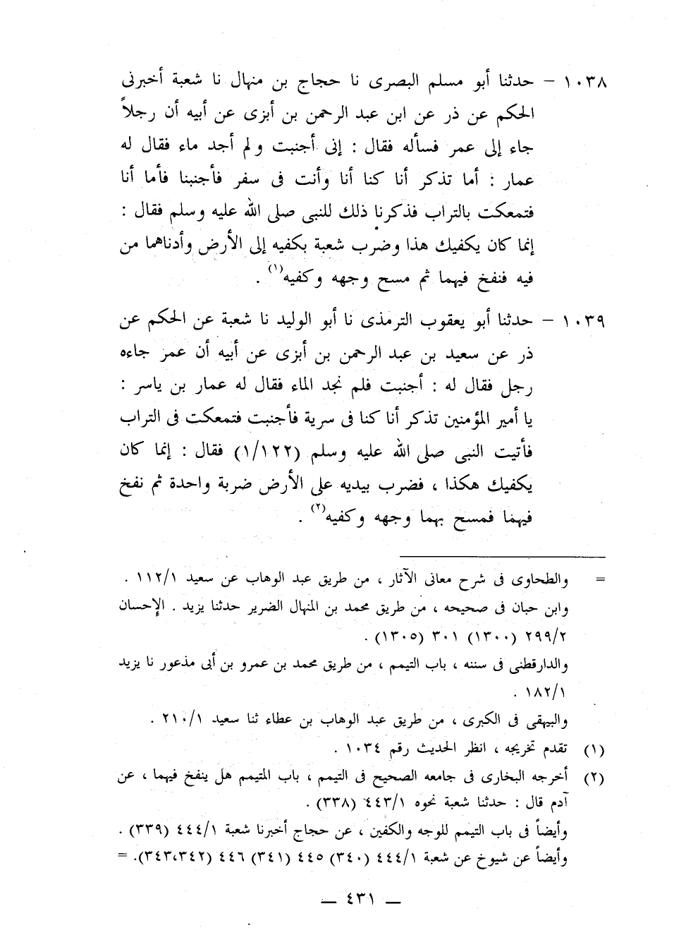 1039 - حَدَّثَنَا أَبُو يَعْقُوبَ التِّرْمِذِيُّ، نا أَبُو الْوَلِيدِ، نا شُعْبَةُ، عَنِ الْحَكَمِ، عَنْ ذَرٍّ، عَنْ سَعِيدِ بْنِ عَبْدِ الرَّحْمَنِ بْنِ أَبْزَى، عَنْ أَبِيهِ، أَنَّ عُمَرَ، جَاءَهُ رَجُلٌ فَقَالَ لَهُ: أَجْنَبْتُ فَلَمْ نَجْدِ الْمَاءَ، فَقَالَ لَهُ عَمَّارُ بْنُ يَاسِرٍ: يَا أَمِيرَ الْمُؤْمِنِينَ، تَذْكُرُ أَنَّا كُنَّا فِي سَرِيَّةٍ، فَأَجْنَبْتُ فَتَمَعَّكْتُ فِي التُّرَابِ، فَأَتَيْتُ النَّبِيَّ صَلَّى اللهُ عَلَيْهِ وَسَلَّمَ، فَقَالَ: «§إِنَّمَا كَانَ يَكْفِيكَ هَكَذَا» ، فَضَرَبَ بِيَدَيْهِ عَلَى الْأَرْضِ ضَرْبَةً وَاحِدَةً، ثُمَّ نَفَخَ فِيهِمَا فَمَسَحَ بِهِمَا وَجْهَهُ وَكَفَّيْهِ