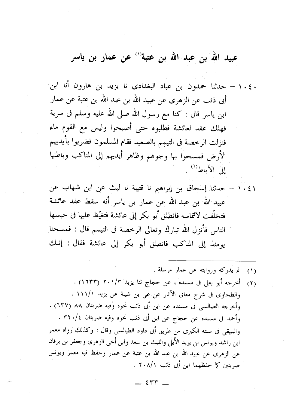 1040 - حَدَّثَنَا حَمْدُونُ بْنُ عَبَّادٍ الْبَغْدَادِيُّ، نا يَزِيدُ بْنُ هَارُونَ، أنا ابْنُ أَبِي ذِئْبٍ، عَنِ الزُّهْرِيِّ، عَنْ عُبَيْدِ اللَّهِ بْنِ عَبْدِ اللَّهِ بْنِ عُتْبَةَ، عَنْ عَمَّارِ بْنِ يَاسِرٍ قَالَ: «كُنَّا مَعَ رَسُولِ اللَّهِ صَلَّى اللهُ عَلَيْهِ وَسَلَّمَ فِي سَرِيَّةٍ فَهَلَكَ عِقْدٌ، لِعَائِشَةَ فَطَلَبُوهُ حَتَّى أَصْبَحُوا وَلَيْسَ مَعَ الْقَوْمِ مَاءٌ، §فَنَزَلَتِ الرُّخْصَةُ فِي التَّيَمُّمِ بِالصَّعِيدِ، فَقَامَ الْمُسْلِمُونُ فَضَرَبُوا بِأَيْدِيهِمُ الْأَرْضَ فَمَسَحُوا بِهَا وُجُوهَهُمْ وَظَاهَرَ أَيْدِيهِمْ إِلَى الْمَنَاكِبِ وَبَاطِنَهَا إِلَى الْآبَاطِ»