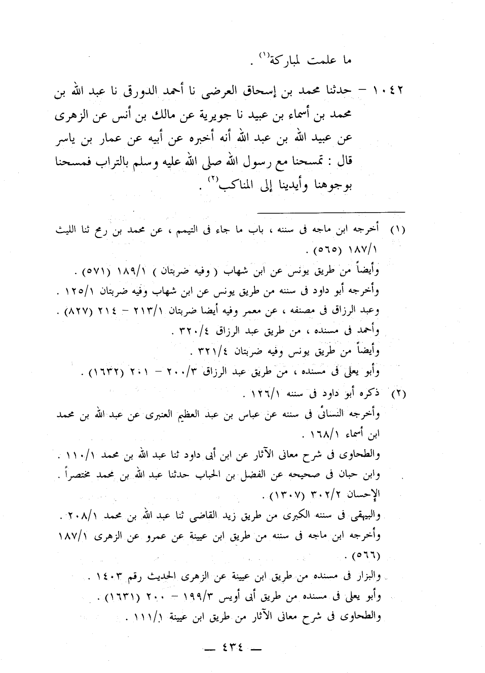 1042 - حَدَّثَنَا مُحَمَّدُ بْنُ إِسْحَاقَ الْعُرْضِيُّ، نا أَحْمَدُ الدَّوْرَقِيُّ، نا عَبْدُ اللَّهِ بْنُ مُحَمَّدِ بْنِ أَسْمَاءَ بْنِ عُبَيْدٍ، نا جُوَيْرِيَةُ، عَنْ مَالِكِ بْنِ أَنَسٍ، عَنِ الزُّهْرِيِّ، عَنْ عُبَيْدِ اللَّهِ بْنِ عَبْدِ اللَّهِ، أَنَّهُ أَخْبَرَهُ، عَنْ أَبِيهِ، عَنْ عَمَّارِ بْنِ يَاسِرٍ قَالَ: §تَمَسَّحْنَا مَعَ رَسُولِ اللَّهِ صَلَّى اللهُ عَلَيْهِ وَسَلَّمَ بِالتُّرَابِ، فَمَسَحْنَا بِوُجُوهِنَا وَأَيْدِينَا إِلَى الْمَنَاكِبِ