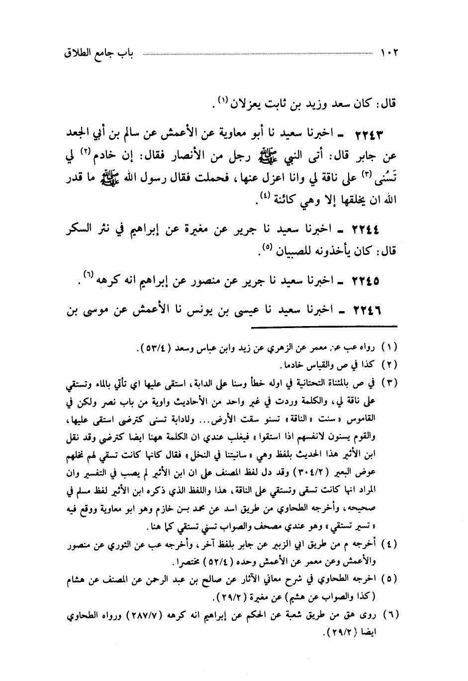 2243- أَخْبَرَنَا سَعِيدٌ ، حَدَّثَنَا أَبُو مُعَاوِيَةَ ، عَنِ الأَعْمَشِ ، عَنْ سَالِمِ بْنِ أَبِي الْجَعْدِ ، عَنْ جَابِرٍ ، قَالَ : أَتَى النَّبِيَّ صَلَّى اللَّهُ عَلَيْهِ وَسَلَّمَ رَجُلٌ مِنَ الأَنْصَارِ فَقَالَ : إِنَّ خَادِمًا لِي تَسَنَّى عَلَى نَاقَةٍ لِي ، وَأَنَا أَعْزِلُ عَنْهَا ، فَحَمَلَتْ ، فَقَالَ رَسُولُ اللهِ صَلَّى اللَّهُ عَلَيْهِ وَسَلَّمَ : مَا قَدَّرَ اللَّهُ أَنْ يَخْلُقَهَا إِلاَّ وَهِيَ كَائِنَةٌ.