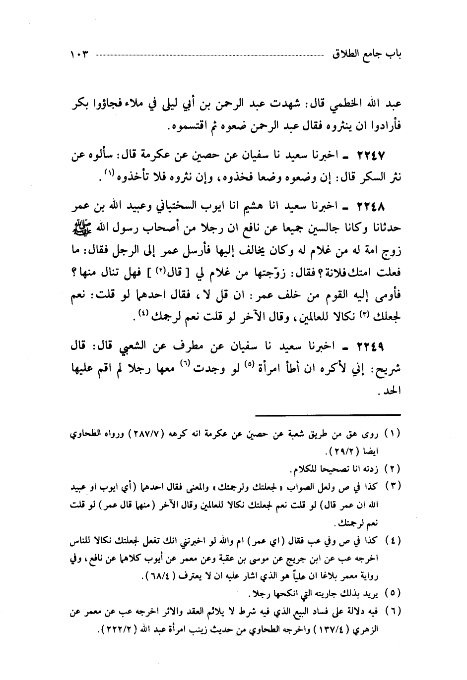 2248- أَخْبَرَنَا سَعِيدٌ ، أَخْبَرَنَا هُشَيْمٌ ، أَخْبَرَنَا أَيُّوبُ السَّخْتِيَانِيُّ ، وَعُبَيْدُ اللهِ بْنُ عُمَرَ ، حَدَّثَانَا وَكَانَا جَالِسَيْنِ جَمِيعًا عَنْ نَافِعٍ ، أَنَّ رَجُلاً مِنْ أَصْحَابِ رَسُولِ اللهِ صَلَّى اللَّهُ عَلَيْهِ وَسَلَّمَ زَوَّجَ أَمَةً لَهُ مِنْ غُلاَمٍ لَهُ وَكَانَ يُخَالِفُ إِلَيْهَا ، فَأَرْسَلَ عُمَرُ إِلَى الرَّجُلِ ، فَقَالَ : مَا فَعَلَتْ أَمَتُكَ فُلاَنَةُ ؟ فَقَالَ : زَوَّجْتُهَا مِنْ غُلاَمٍ لِي قَالَ : فَهَلْ تَنَالُ مِنْهَا ؟ فَأَوْمَى إِلَيْهِ الْقَوْمُ مِنْ خَلْفِ عُمَرَ : أَنْ قُلْ : لاَ ، فَقَالَ أَحَدُهُمَا : لَوْ قُلْتَ : نَعَمْ لَجَعَلَكَ نَكَالاً لِلْعَالَمِينَ ، وَقَالَ الآخَرُ : لَوْ قُلْتَ : نَعَمْ لَرَجَمَكَ.