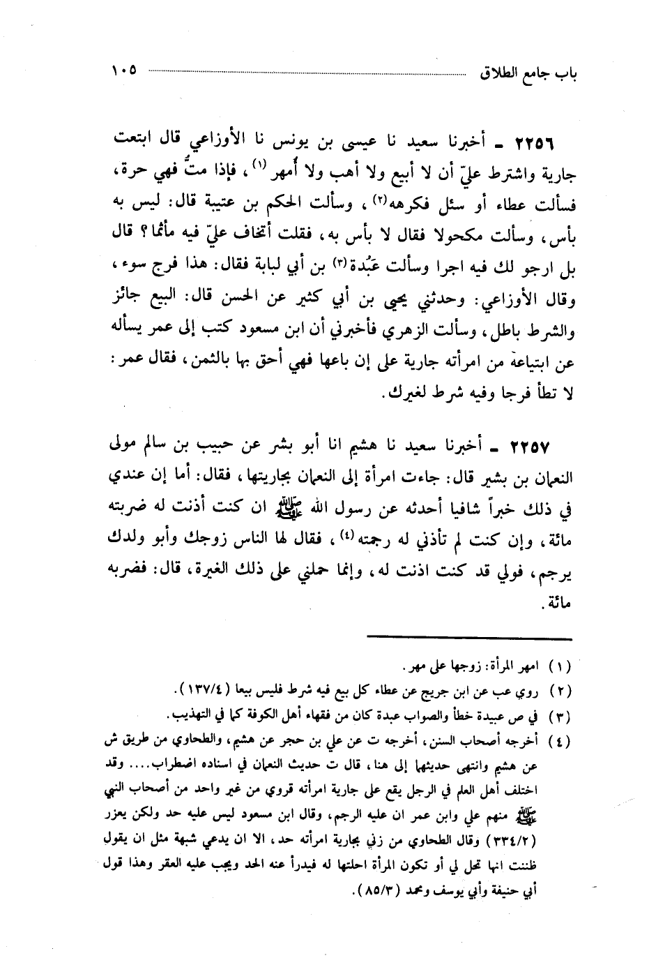 2256- أَخْبَرَنَا سَعِيدٌ ، حَدَّثَنَا عِيسَى بْنُ يُونُسَ ، حَدَّثَنَا الأَوْزَاعِيُّ ، قَالَ : ابْتَعْتُ جَارِيَةً وَاشْتُرِطَ عَلَيَّ أَنْ لاَ أَبِيعَ وَلاَ أَهَبَ وَلاَ أُمْهِرَ ، فَإِذَا مُتُّ فَهِيَ حُرَّةٌ ، فَسَأَلْتُ عَطَاءً - أَوْ سُئِلَ - فَكَرِهَهُ ، وَسَأَلْتُ الْحَكَمَ بْنَ عُتَيْبَةَ قَالَ : لَيْسَ بِهِ بَأْسٌ ، وَسَأَلْتُ مَكْحُولاً ، فَقَالَ : لاَ بَأْسَ بِهِ ، فَقُلْتُ : أَتَخَافُ عَلَيَّ فِيهِ مَأْثَمًا ؟ قَالَ : بَلْ أَرْجُو لَكَ فِيهِ أَجْرًا ، وَسَأَلْتُ عَبْدَةَ بْنَ أَبِي لُبَابَةَ ، فَقَالَ : هَذَا فَرْجُ سُوءٍ ، وَقَالَ الأَوْزَاعِيُّ : وَحَدَّثَنِي يَحْيَى بْنُ أَبِي كَثِيرٍ عَنِ الْحَسَنِ قَالَ : الْبَيْعُ جَائِزٌ وَالشَّرْطُ بَاطِلٌ ، وَسَأَلْتُ الزُّهْرِيَّ ، فَأَخْبَرَنِي أَنَّ ابْنَ مَسْعُودٍ كَتَبَ إِلَى عُمَرَ يَسْأَلُهُ عَنِ ابْتِيَاعِهِ مِنِ امْرَأَتِهِ جَارِيَةً عَلَى إِنْ بَاعَهَا فَهِيَ أَحَقُّ بِهَا بِالثَّمَنِ ، فَقَالَ عُمَرُ : لاَ تَطَأْ فَرْجًا وَفِيهِ شَرْطٌ لِغَيْرِكَ.