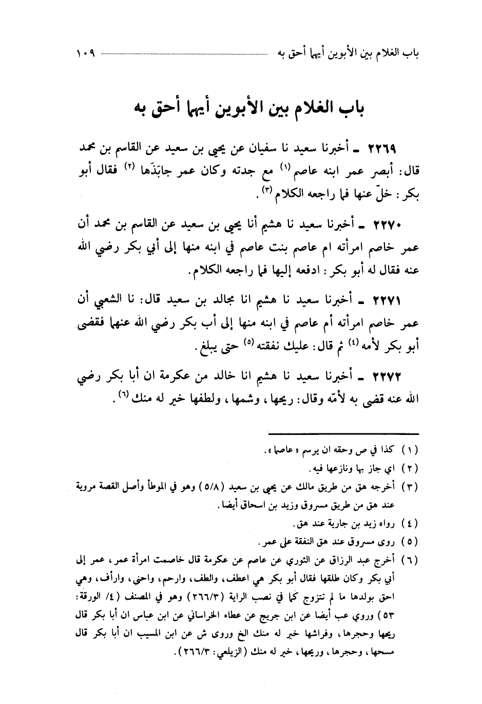 2270- أَخْبَرَنَا سَعِيدٌ ، حَدَّثَنَا هُشَيْمٌ ، أَخْبَرَنَا يَحْيَى بْنُ سَعِيدٍ ، عَنِ الْقَاسِمِ بْنِ مُحَمَّدٍ ، أَنَّ عُمَرَ خَاصَمَ امْرَأَتَهُ أُمَّ عَاصِمٍ بِنْتَ عَاصِمٍ فِي ابْنِهِ مِنْهَا إِلَى أَبِي بَكْرٍ رَضِيَ اللَّهُ عَنْهُ ، فَقَالَ لَهُ أَبُو بَكْرٍ : ادْفَعْهُ إِلَيْهَا فَمَا رَاجَعَهُ الْكَلاَمَ.
