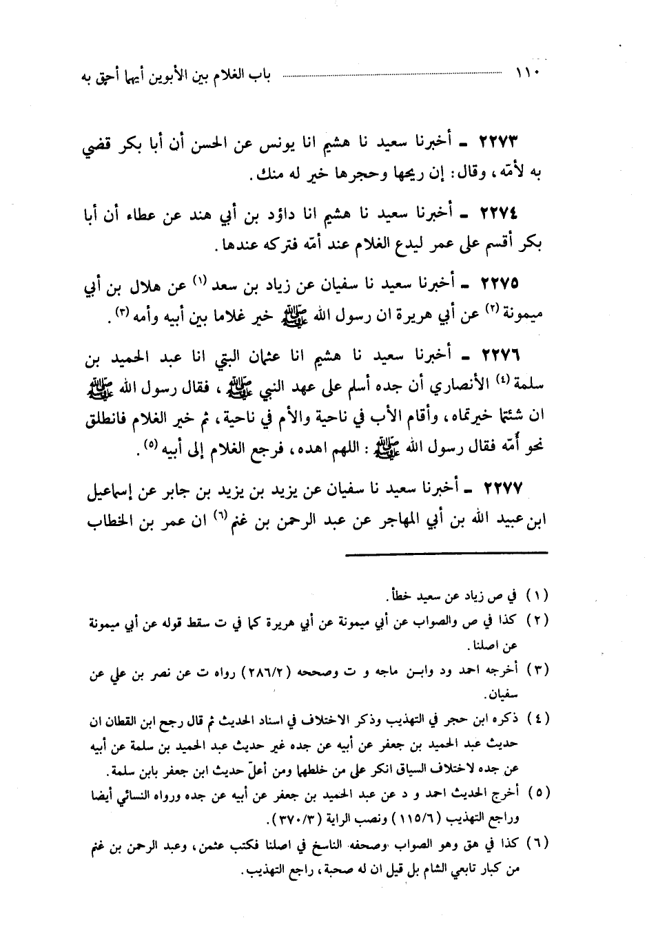 2277- أَخْبَرَنَا سَعِيدٌ ، حَدَّثَنَا سُفْيَانُ ، عَنْ يَزِيدَ بْنِ يَزِيدَ بْنِ جَابِرٍ ، عَنْ إِسْمَاعِيلَ بْنِ عُبَيْدِ اللهِ بْنِ أَبِي الْمُهَاجِرِ ، عَنْ عَبْدِ الرَّحْمَنِ بْنِ غَنْمٍ ، أَنَّ عُمَرَ بْنَ الْخَطَّابِ ، رَضِيَ اللَّهُ عَنْهُ خَيَّرَ غُلاَمًا بَيْ أَبِيهِ وَبَيْنَ أُمِّهِ.