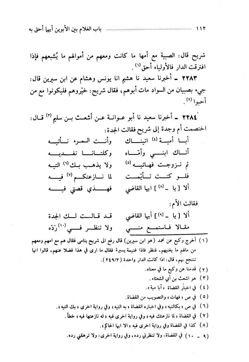 2283- أَخْبَرَنَا سَعِيدٌ ، حَدَّثَنَا هُشَيْمٌ ، أَخْبَرَنَا يُونُسُ ، وَهِشَامٌ ، عَنِ ابْنِ سِيرِينَ ، قَالَ : جِيءَ بِصِبْيَانٍ مِنَ السَّوَادِ مَاتَ أَبُوهُمْ ، فَقَالَ شُرَيْحٌ : خَيِّرُوهُمْ ، فَلْيَكُونُوا مَعَ مَنْ أَحَبُّوا.