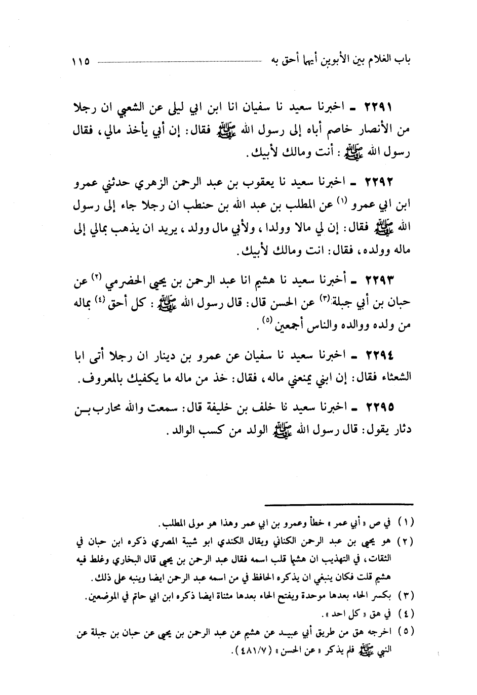 2293- أَخْبَرَنَا سَعِيدٌ ، حَدَّثَنَا هُشَيْمٌ ، أَخْبَرَنَا عَبْدُ الرَّحْمَنِ بْنُ يَحْيَى الْحَضْرَمِيُّ ، عَنْ حَبَّانَ بْنِ أَبِي جَبَلَةَ ، عَنِ الْحَسَنِ ، قَالَ : قَالَ رَسُولُ اللهِ صَلَّى اللَّهُ عَلَيْهِ وَسَلَّمَ : كُلٌّ أَحَقُّ بِمَالِهِ مِنْ وَلَدِهِ وَوَالِدِهِ وَالنَّاسِ أَجْمَعِينَ.