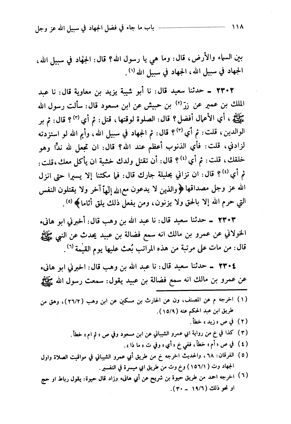 2302- حَدَّثَنَا أَبُو شَيْبَةَ يَزِيدُ بْنُ مُعَاوِيَةَ ، قَالَ : حَدَّثَنَا عَبْدُ الْمَلِكِ بْنُ عُمَيْرٍ ، عَنْ زِرِّ بْنِ حُبَيْشٍ ، عَنِ ابْنِ مَسْعُودٍ قَالَ : سَأَلْتُ رَسُولَ اللهِ صَلَّى اللَّهُ عَلَيْهِ وَسَلَّمَ ، أَيُّ الأَعْمَالِ أَفْضَلُ ؟ قَالَ : الصَّلاَةُ لِوَقْتِهَا قُلْتُ : ثُمَّ أَيُّ ؟ قَالَ : ثُمَّ بِرُّ الْوَالِدَيْنِ قُلْتُ : ثُمَّ أَيُّ ؟ قَالَ : ثُمَّ الْجِهَادُ فِي سَبِيلِ اللهِ وَأيْمُ اللهِ لَوِ اسْتَزَدْتُهُ لَزَادَنِي قُلْتُ : فَأَيُّ الذُّنُوبِ أَعْظَمُ عِنْدَ اللهِ ؟ قَالَ : أَنْ تَجْعَلَ لِلَّهِ نِدًّا ، وَهُوَ خَلَقَكَ قُلْتُ : ثُمَّ أَيُّ ؟ قَالَ : أَنْ تَقْتُلَ وَلَدَكَ خَشْيَةَ أَنْ يَأْكُلَ مَعَكَ قُلْتُ : ثُمَّ أَيُّ ؟ قَالَ : أَنْ تُزَانِيَ بِحَلِيلَةِ جَارِكَ قَالَ : فَمَا مَكَثْنَا إِلاَّ يَسِيرًا حَتَّى أَنْزَلَ اللَّهُ عَزَّ وَجَلَّ مِصْدَاقَهَا {وَالَّذِينَ لاَ يَدْعُونَ مَعَ اللهِ إِلَهًا آخَرَ وَلاَ يَقْتُلُونَ النَّفْسَ الَّتِي حَرَّمَ اللَّهُ إِلاَّ بِالْحَقِّ وَلاَ يَزْنُونَ وَمَنْ يَفْعَلْ ذَلِكَ يَلْقَ أَثَامًا}.