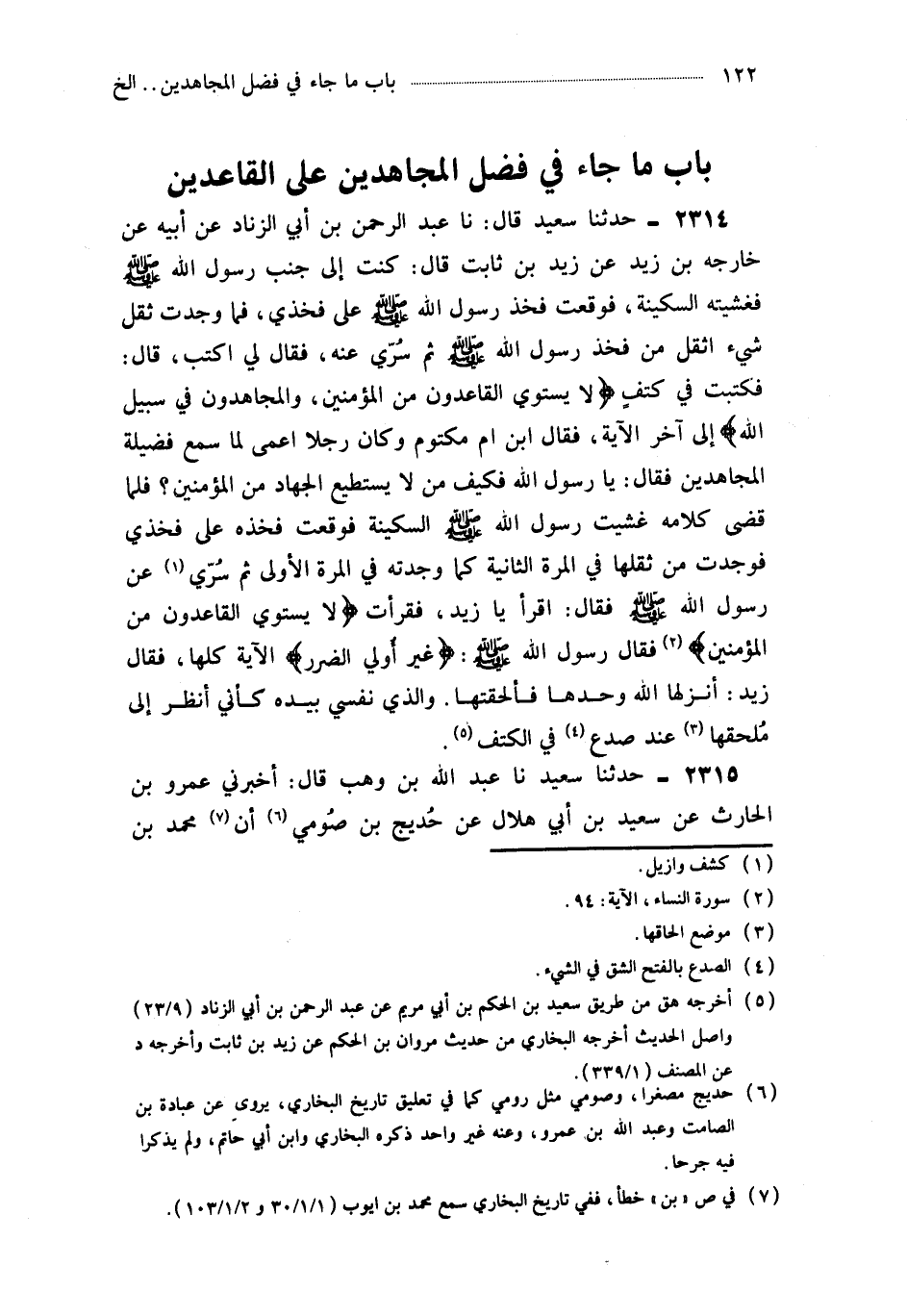 2314- حَدَّثَنَا عَبْدُ الرَّحْمَنِ بْنُ أَبِي الزِّنَادِ ، عَنْ أَبِيهِ ، عَنْ خَارِجَةَ بْنِ زَيْدٍ ، عَنْ زَيْدِ بْنِ ثَابِتٍ ، قَالَ : كُنْتُ إِلَى جَنْبِ رَسُولِ اللهِ صَلَّى اللَّهُ عَلَيْهِ وَسَلَّمَ فَغَشِيَتْهُ السَّكِينَةُ ، فَوَقَعَتْ فَخِذُ رَسُولِ اللهِ صَلَّى اللَّهُ عَلَيْهِ وَسَلَّمَ عَلَى فَخِذِي ، فَمَا وَجَدْتُ ثِقَلَ شَيْءٍ أَثْقَلَ مِنْ فَخِذِ رَسُولِ اللهِ صَلَّى اللَّهُ عَلَيْهِ وَسَلَّمَ ثُمَّ سُرِّيَ عَنْهُ ، فَقَالَ لِي : اكْتُبْ قَالَ : فَكَتَبْتُ فِي كَتِفٍ {لاَ يَسْتَوِي الْقَاعِدُونَ مِنَ الْمُؤْمِنِينَ} {وَالْمُجَاهِدُونَ فِي سَبِيلِ اللهِ} إِلَى آخِرِ الآيَةِ ، فَقَالَ ابْنُ أُمِّ مَكْتُومٍ وَكَانَ رَجُلاً أَعْمَى لَمَّا سَمِعَ فَضِيلَةَ الْمُجَاهِدِينَ ، فَقَالَ : يَا رَسُولَ اللهِ ، فَكَيْفَ مَنْ لاَ يَسْتَطِيعُ الْجِهَادَ مِنَ الْمُؤْمِنِينَ ؟ فَلَمَّا قَضَى كَلاَمَهُ غَشِيَتْ رَسُولَ اللهِ صَلَّى اللَّهُ عَلَيْهِ وَسَلَّمَ السَّكِينَةُ فَوَقَعَتْ فَخِذُهُ عَلَى فَخِذِي فَوَجَدْتُ مِنْ ثِقْلِهَا فِي الْمَرَّةِ الثَّانِيَةِ كَمَا وَجَدْتُهُ فِي الْمَرَّةِ الأُولَى ، ثُمَّ سُرِّيَ عَنْ رَسُولِ اللهِ صَلَّى اللَّهُ عَلَيْهِ وَسَلَّمَ ، فَقَالَ : اقْرَأْ يَا زَيْدُ فَقَرَأْتُ {لاَ يَسْتَوِي الْقَاعِدُونَ مِنَ الْمُؤْمِنِينَ} فَقَالَ رَسُولُ اللهِ صَلَّى اللَّهُ عَلَيْهِ وَسَلَّمَ : {غَيْرُ أُولِي الضَّرَرِ} الآيَةَ كُلَّهَا ، فَقَالَ زَيْدٌ : أَنْزَلَهَا اللَّهُ وَحْدَهَا فَأَلْحَقْتُهَا ، وَالَّذِي نَفْسِي بِيَدِهِ كَأَنِّي أَنْظُرُ إِلَى مُلْحَقِهَا عِنْدَ صَدْعٍ فِي الْكَتِفِ.