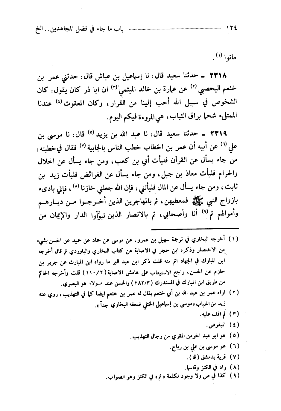 2319- حَدَّثَنَا عَبْدُ اللهِ بْنُ يَزِيدَ ، قَالَ : حَدَّثَنَا مُوسَى بْنُ عَلِيٍّ ، عَنْ أَبِيهِ ، أَنَّ عُمَرَ بْنَ الْخَطَّابِ خَطَبَ النَّاسَ بِالْجَابِيَةِ فَقَالَ فِي خُطْبَتِهِ : مَنْ جَاءَ يَسْأَلُ عَنِ الْقُرْآنِ فَلْيَأْتِ أُبَيَّ بْنَ كَعْبٍ ، وَمَنْ جَاءَ يَسْأَلُ عَنِ الْحَلاَلِ وَالْحَرَامِ فَلْيَأْتِ مُعَاذَ بْنَ جَبَلٍ ، وَمَنْ جَاءَ يَسْأَلُ عَنِ الْفَرَائِضِ فَلْيَأْتِ زَيْدَ بْنَ ثَابِتٍ ، وَمَنْ جَاءَ يَسْأَلُ عَنِ الْمَالِ فَلْيَأْتِنِي ، فَإِنَّ اللَّهَ جَعَلَنِي خَازِنًا ، فَإِنِّي بَادِئٌ بِأَزْوَاجِ النَّبِيِّ صَلَّى اللَّهُ عَلَيْهِ وَسَلَّمَ فَمُعْطِيهُنَّ ، ثُمَّ بِالْمُهَاجِرِينَ الَّذِينَ أُخْرِجُوا مِنْ دِيَارِهِمْ وَأَمْوَالِهِمْ ، ثُمَّ أَنَا وَأَصْحَابِي ، ثُمَّ بِالأَنْصَارِ الَّذِينَ تَبَوَّؤُوا الدَّارَ وَالإِيمَانَ مِنْ قَبْلِهِمْ ، ثُمَّ مَنْ أَسْرَعَ إِلَى الْهِجْرَةِ أَسْرَعَ إِلَيْهِ الْعَطَاءُ ، وَمَنْ أَبْطَأَ عَنِ الْهِجْرَةِ أَبْطَأَ عَنْهُ الْعَطَاءُ ، فَلاَ يَلُومَنَّ رَجُلٌ إِلاَّ مُنَاخَ رَاحِلَتِهِ.