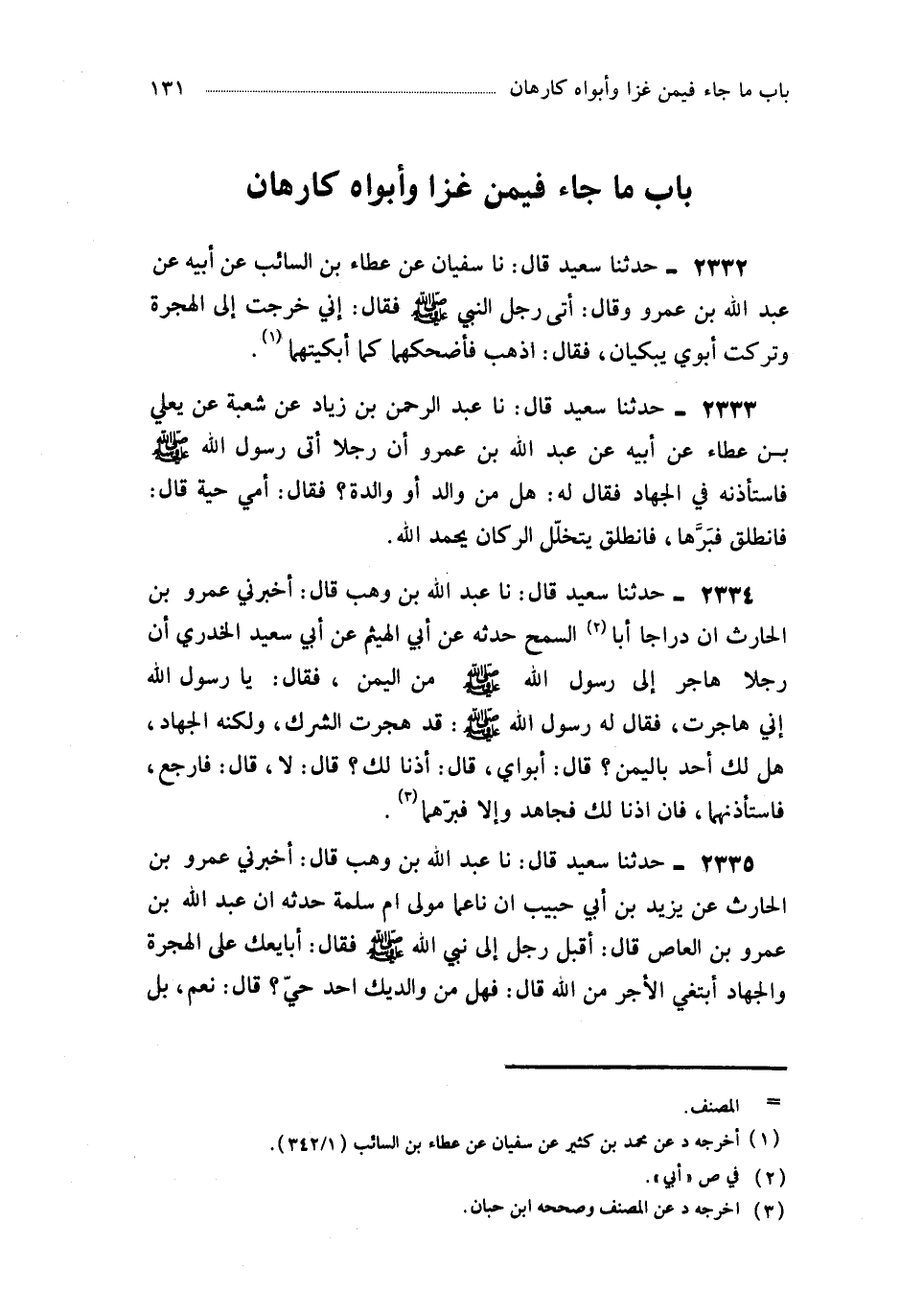 2335- حَدَّثَنَا عَبْدُ اللهِ بْنُ وَهْبٍ ، قَالَ : أَخْبَرَنِي عَمْرُو بْنُ الْحَارِثِ ، عَنْ يَزِيدَ بْنِ أَبِي حَبِيبٍ ، أَنَّ نَاعِمًا مَوْلَى أُمِّ سَلَمَةَ حَدَّثَهُ أَنَّ عَبْدَ اللهِ بْنَ عَمْرِو بْنِ الْعَاصِ قَالَ : أَقْبَلَ رَجُلٌ إِلَى نَبِيِّ اللهِ صَلَّى اللَّهُ عَلَيْهِ وَسَلَّمَ فَقَالَ : أُبَايِعُكَ عَلَى الْهِجْرَةِ وَالْجِهَادِ أَبْتَغِي الأَجْرَ مِنَ اللهِ , قَالَ : فَهَلْ مِنْ وَالِدَيْكَ أَحَدٌ حَيٌّ ؟ قَالَ : نَعَمْ ، بَلْ كِلاَهُمَا , قَالَ : فَتَبْتَغِي الأَجْرَ مِنَ اللهِ ؟ قَالَ : نَعَمْ ، قَالَ : ارْجِعْ إِلَى وَالِدَيْكَ فَأَحْسِنْ صُحْبَتَهُمَا.