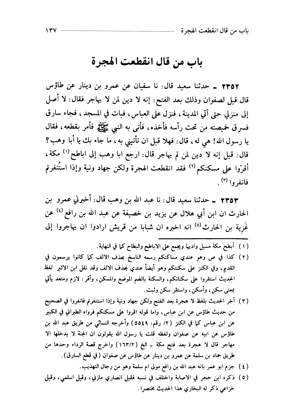 2352- حَدَّثَنَا سُفْيَانُ ، عَنْ عَمْرِو بْنِ دِينَارٍ ، عَنْ طَاوُوسٍ ، قَالَ : قِيلَ لِصَفْوَانَ ، وَذَلِكَ بَعْدَ الْفَتْحِ : إِنَّهُ لاَ دِينَ لِمَنْ لاَ يُهَاجِرُ ، فَقَالَ : لاَ أَصِلُ إِلَى مَنْزِلِي حَتَّى آتِيَ الْمَدِينَةَ ، فَنَزَلَ عَلَى الْعَبَّاسِ ، فَبَاتَ فِي الْمَسْجِدِ ، فَجَاءَ سَارِقٌ فَسَرَقَ خَمِيصَتَهُ مِنْ تَحْتِ رَأْسِهِ فَأَخَذَهُ ، فَأَتَى بِهِ النَّبِيَّ صَلَّى اللَّهُ عَلَيْهِ وَسَلَّمَ فَأَمَرَ بِقَطْعِهِ ، فَقَالَ : يَا رَسُولَ اللهِ ، هِيَ لَهُ ، قَالَ : فَهَلاَّ قَبْلَ أَنْ تَأْتِيَنِي بِهِ ، مَا جَاءَ بِكَ يَا أَبَا وَهْبٍ ؟ قَالَ : قِيلَ إِنَّهُ لاَ دِينَ لِمَنْ لَمْ يُهَاجِرْ ، قَالَ : ارْجِعْ أَبَا وَهْبٍ إِلَى أَبَاطِحِ مَكَّةَ ، أَقِرُّوا عَلَى مَسْكَنِكُمْ فَقَدِ انْقَطَعَتِ الْهِجْرَةُ ، وَلَكِنْ جِهَادٌ وَنِيَّةٌ ، وَإِذَا اسْتُنْفِرْتُمْ فَانْفِرُوا.