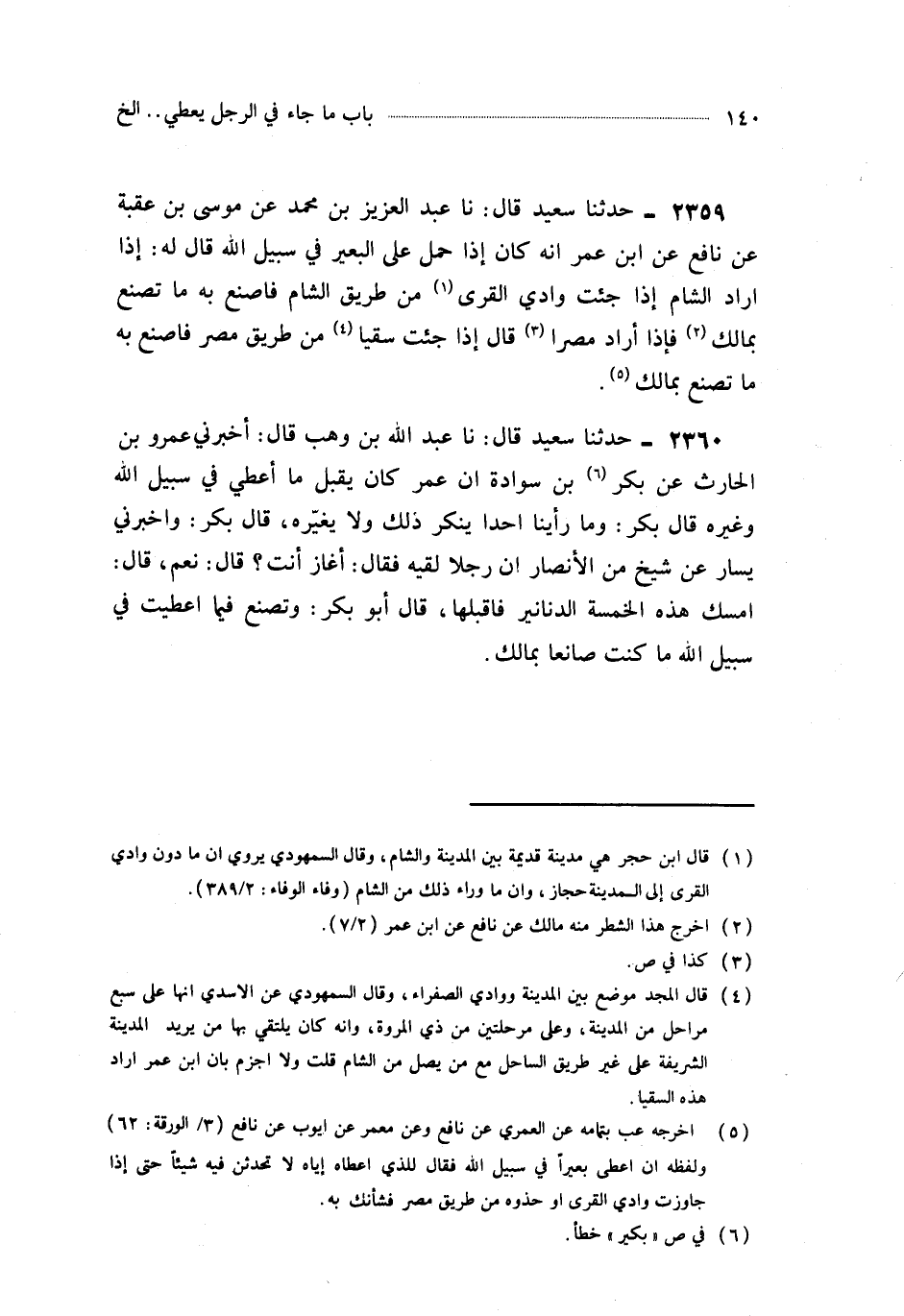 2359- حَدَّثَنَا عَبْدُ الْعَزِيزِ بْنُ مُحَمَّدٍ ، عَنْ مُوسَى بْنِ عُقْبَةَ ، عَنْ نَافِعٍ ، عَنِ ابْنِ عُمَرَ ، أَنَّهُ كَانَ إِذَا حَمَلَ عَلَى الْبَعِيرِ فِي سَبِيلِ اللهِ قَالَ لَهُ : إِذَا أَرَادَ الشَّامَ إِذَا جِئْتَ وَادِيَ الْقُرَى مِنْ طَرِيقِ الشَّامِ فَاصْنَعْ بِهِ مَا تَصْنَعُ بِمَالِكَ ، فَإِذَا أَرَادَ مِصْراً قَالَ : إِذَا جِئْتَ سُقْيَا مِنْ طَرِيقِ مِصْرَ فَاصْنَعْ بِهِ مَا تَصْنَعُ بِمَالِكَ.