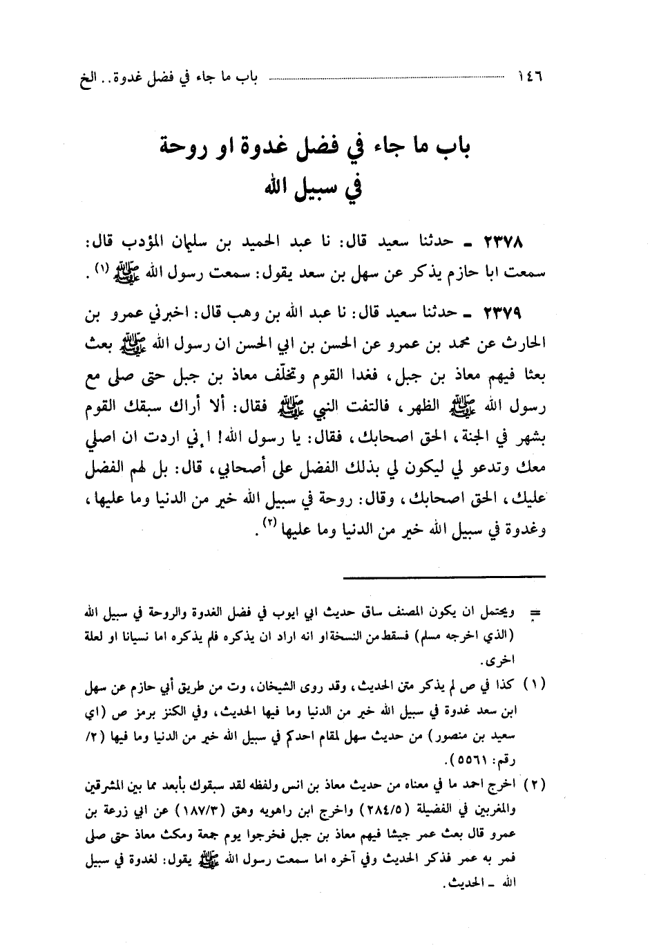 2379- حَدَّثَنَا عَبْدُ اللهِ بْنُ وَهْبٍ ، قَالَ : أَخْبَرَنِي عَمْرُو بْنُ الْحَارِثِ ، عَنْ مُحَمَّدِ بْنِ عَمْرٍو ، عَنِ الْحَسَنِ بْنِ أَبِي الْحَسَنِ ، أَنَّ رَسُولَ اللهِ صَلَّى اللَّهُ عَلَيْهِ وَسَلَّمَ بَعَثَ بَعْثًا فِيهِمْ مُعَاذُ بْنُ جَبَلٍ ، فَغَدَا الْقَوْمُ وَتَخَلَّفَ مُعَاذُ بْنُ جَبَلٍ حَتَّى صَلَّى مَعَ رَسُولِ اللهِ صَلَّى اللَّهُ عَلَيْهِ وَسَلَّمَ الظُّهْرَ ، فَالْتَفَتَ النَّبِيُّ صَلَّى اللَّهُ عَلَيْهِ وَسَلَّمَ ، فَقَالَ : أَلاَ أَرَاكَ سَبَقَكَ الْقَوْمُ بِشَهْرٍ فِي الْجَنَّةِ ، الْحَقْ أَصْحَابَكَ فَقَالَ : يَا رَسُولَ اللهِ إِنِّي أَرَدْتُ أَنْ أُصَلِّيَ مَعَكَ وَتَدْعُوَ لِي لِيَكُونَ لِي بِذَلِكَ الْفَضْلُ عَلَى أَصْحَابِي قَالَ : بَلْ لَهُمُ الْفَضْلُ عَلَيْكَ ، الْحَقْ أَصْحَابَكَ وَقَالَ : رَوْحَةٌ فِي سَبِيلِ اللهِ خَيْرٌ مِنَ الدُّنْيَا وَمَا عَلَيْهَا ، وَغَدْوَةٌ فِي سَبِيلِ اللهِ خَيْرٌ مِنَ الدُّنْيَا وَمَا عَلَيْهَا.