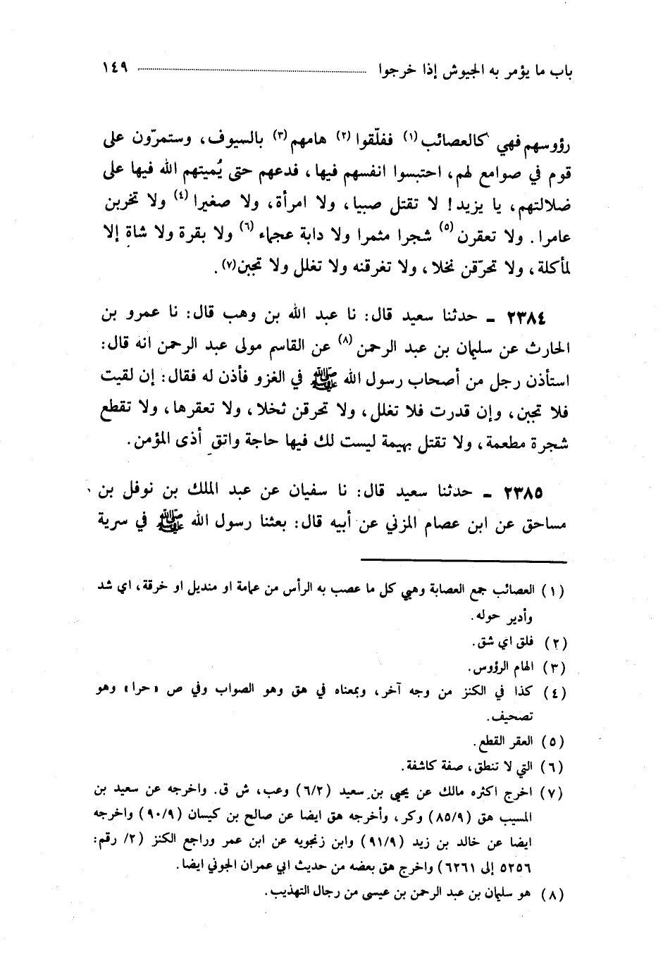 2384- حَدَّثَنَا عَبْدُ اللهِ بْنُ وَهْبٍ ، قَالَ : حَدَّثَنَا عَمْرُو بْنُ الْحَارِثِ ، عَنْ سُلَيْمَانَ بْنِ عَبْدِ الرَّحْمَنِ ، عَنِ الْقَاسِمِ مَوْلَى عَبْدِ الرَّحْمَنِ أَنَّهُ قَالَ : اسْتَأْذَنَ رَجُلٌ مِنْ أَصْحَابِ رَسُولِ اللهِ صَلَّى اللَّهُ عَلَيْهِ وَسَلَّمَ فِي الْغَزْوِ فَأَذِنَ لَهُ فَقَالَ : إِنْ لَقِيتَ فَلاَ تَجْبُنْ ، وَإِنْ قَدَرْتَ فَلاَ تَغْلُلْ ، وَلاَ تَحْرِقَنَّ نَخْلاً ، وَلاَ تَعْقِرْهَا ، وَلاَ تَقْطَعْ شَجَرَةً مَطْعَمَةً ، وَلاَ تَقْتُلْ بَهِيمَةً لَيْسَتْ لَكَ فِيهَا حَاجَةٌ ، وَاتَّقِ أَذَى الْمُؤْمِنِ.