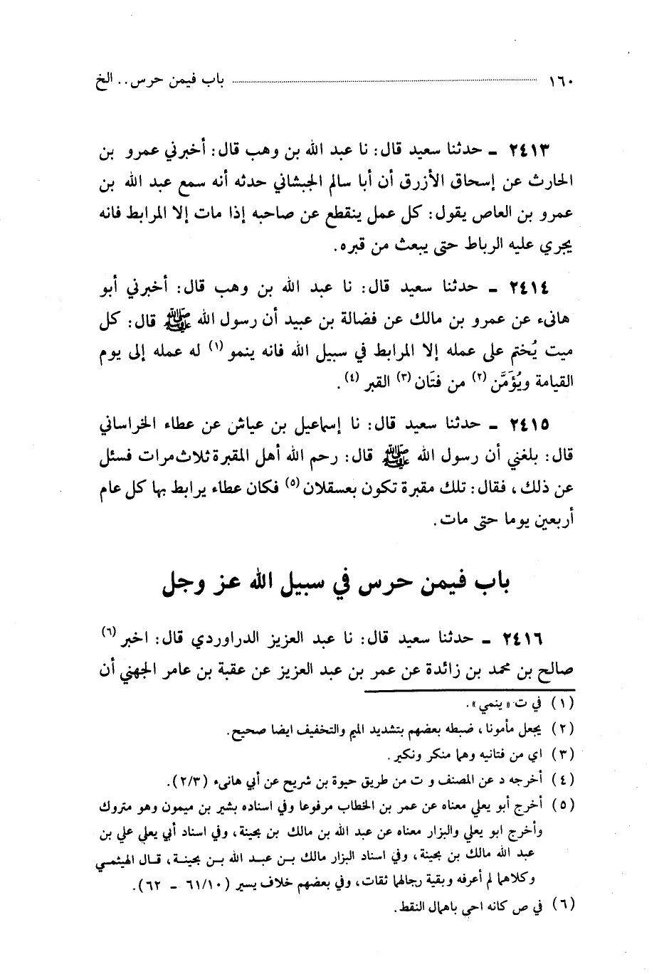 2414- حَدَّثَنَا عَبْدُ اللهِ بْنُ وَهْبٍ ، قَالَ : أَخْبَرَنِي أَبُو هَانِئٍ ، عَنْ عَمْرِو بْنِ مَالِكٍ ، عَنْ فَضَالَةَ بْنِ عُبَيْدٍ ، أَنَّ رَسُولَ اللهِ صَلَّى اللَّهُ عَلَيْهِ وَسَلَّمَ قَالَ : كُلُّ مَيِّتٍ يُخْتَمُ عَلَى عَمَلِهِ إِلاَّ الْمُرَابِطَ فِي سَبِيلِ اللهِ ، فَإِنَّهُ يَنْمُو لَهُ عَمَلُهُ إِلَى يَوْمِ الْقِيَامَةِ ، وَيُؤَمَّنُ مِنْ فَتَّانِ الْقَبْرِ.