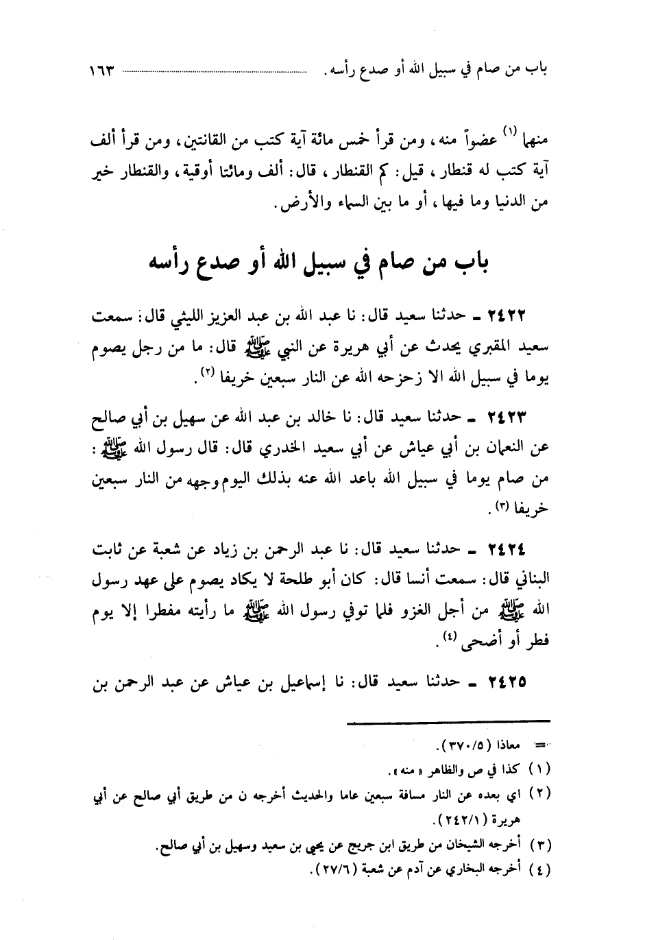 2425- حَدَّثَنَا إِسْمَاعِيلُ بْنُ عَيَّاشٍ ، عَنْ عَبْدِ الرَّحْمَنِ بْنِ زِيَادِ بْنِ أَنْعُمٍ ، عَنْ عَبْدِ اللهِ بْنِ يَزِيدَ ، عَنْ عَبْدِ اللهِ بْنِ عَمْرٍو ، عَنْ رَسُولِ اللهِ صَلَّى اللَّهُ عَلَيْهِ وَسَلَّمَ قَالَ : مَنْ صُدِعَ رَأْسَهُ فِي سَبِيلِ اللهِ فَاحْتَسَبَ غَفَرَ اللَّهُ لَهُ مَا كَانَ قَبْلَ ذَلِكَ مِنْ ذَنْبٍ.