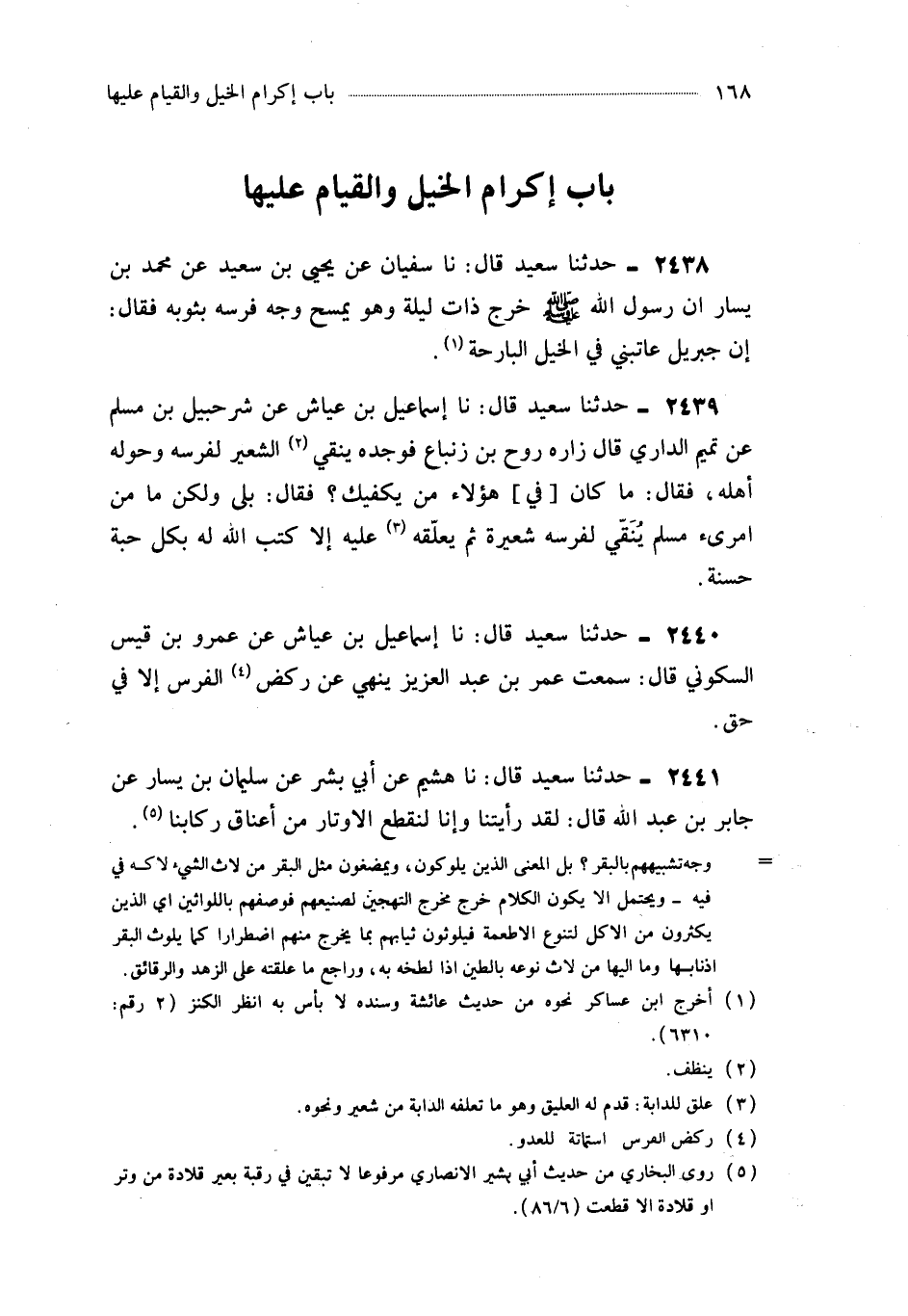 2438- حَدَّثَنَا سُفْيَانُ عَنْ يَحْيَى بْنِ سَعِيدٍ عَنْ مُحَمَّدِ بْنِ يَسَارٍ أَنَّ رَسُولَ اللهِ صَلَّى اللَّهُ عَلَيْهِ وَسَلَّمَ خَرَجَ ذَاتَ لَيْلَةٍ وَهُوَ يَمْسَحُ وَجْهَ فَرَسِهِ بِثَوْبِهِ ، فَقَالَ : إِنَّ جِبْرِيلَ عَاتَبَنِي فِي الْخَيْلِ الْبَارِحَةَ.
