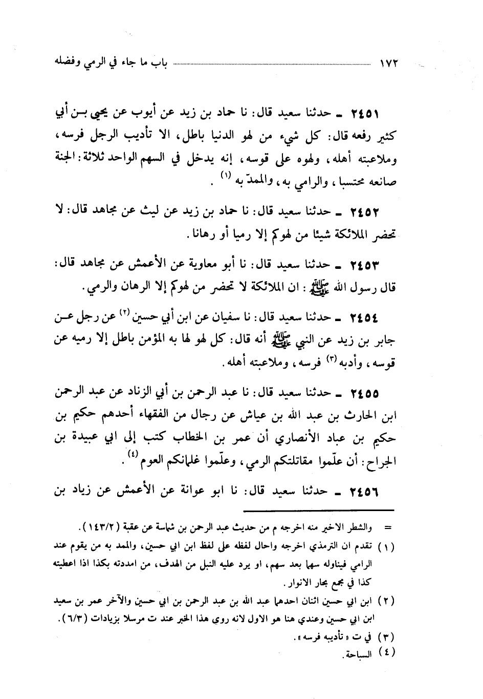 2452- حَدَّثَنَا حَمَّادُ بْنُ زَيْدٍ ، عَنْ لَيْثٍ ، عَنْ مُجَاهِدٍ ، قَالَ : لاَ تَحْضُرُ الْمَلاَئِكَةُ شَيْئًا مِنْ لَهْوِكُمْ إِلاَّ رَمْيًا أَوْ رِهَانًا.