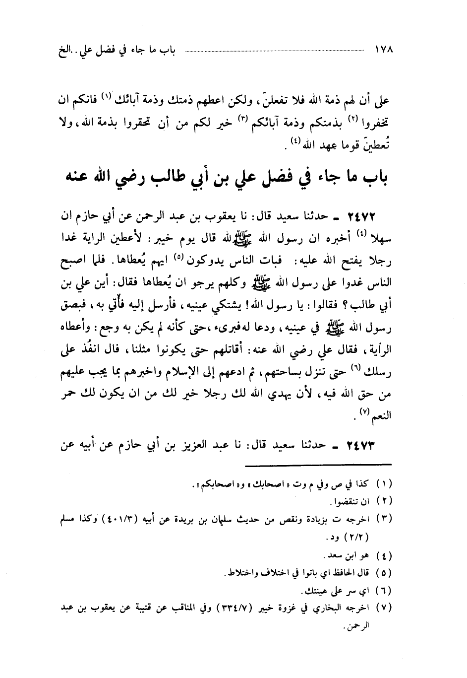 2472- حَدَّثَنَا يَعْقُوبُ بْنُ عَبْدِ الرَّحْمَنِ ، عَنْ أَبِي حَازِمٍ ، أَنَّ سَهْلاً أَخْبَرَهُ أَنَّ رَسُولَ اللهِ صَلَّى اللَّهُ عَلَيْهِ وَسَلَّمَ قَالَ يَوْمَ خَيْبَرَ : لأُعْطِيَنَّ الرَّايَةَ غَدًا رَجُلاً يَفْتَحُ اللَّهُ عَلَيْهِ ، فَبَاتَ النَّاسُ يَدُوكُونَ أَيُّهُمْ يُعْطَاهَا ، فَلَمَّا أَصْبَحَ النَّاسُ غَدَوْا عَلَى رَسُولِ اللهِ صَلَّى اللَّهُ عَلَيْهِ وَسَلَّمَ وَكُلُّهُمْ يَرْجُو أَنْ يُعْطَاهَا فَقَالَ : أَيْنَ عَلِيُّ بْنُ أَبِي طَالِبٍ ؟ ، فَقَالُوا : يَا رَسُولَ اللهِ ، يَشْتَكِي عَيْنَيْهِ ، فَأَرْسَلَ إِلَيْهِ فَأُتِيَ بِهِ ، فَبَصَقَ رَسُولُ اللهِ صَلَّى اللَّهُ عَلَيْهِ وَسَلَّمَ فِي عَيْنَيْهِ ، وَدَعَا لَهُ فَبَرِئَ ، حَتَّى كَأَنَّهُ لَمْ يَكُنْ بِهِ وَجَعٌ : وَأَعْطَاهُ الرَّايَةَ ، فَقَالَ عَلِيٌّ رَضِيَ اللَّهُ عَنْهُ : أُقَاتِلُهُمْ حَتَّى يَكُونُوا مِثْلَنَا , قَالَ : انْفُذْ عَلَى رِسْلِكَ حَتَّى تَنْزِلَ بِسَاحَتِهِمْ ، ثُمَّ ادْعُهُمْ إِلَى الإِسْلاَمِ ، وَأَخْبِرْهُمْ بِمَا يَجِبُ عَلَيْهِمْ مِنْ حَقِّ اللهِ فِيهِ ، لأَنْ يَهْدِيَ اللَّهُ لكَ رَجُلاً خَيْرٌ لَكَ مِنْ أَنْ يَكُونَ لَكَ حُمْرُ النَّعَمِ.