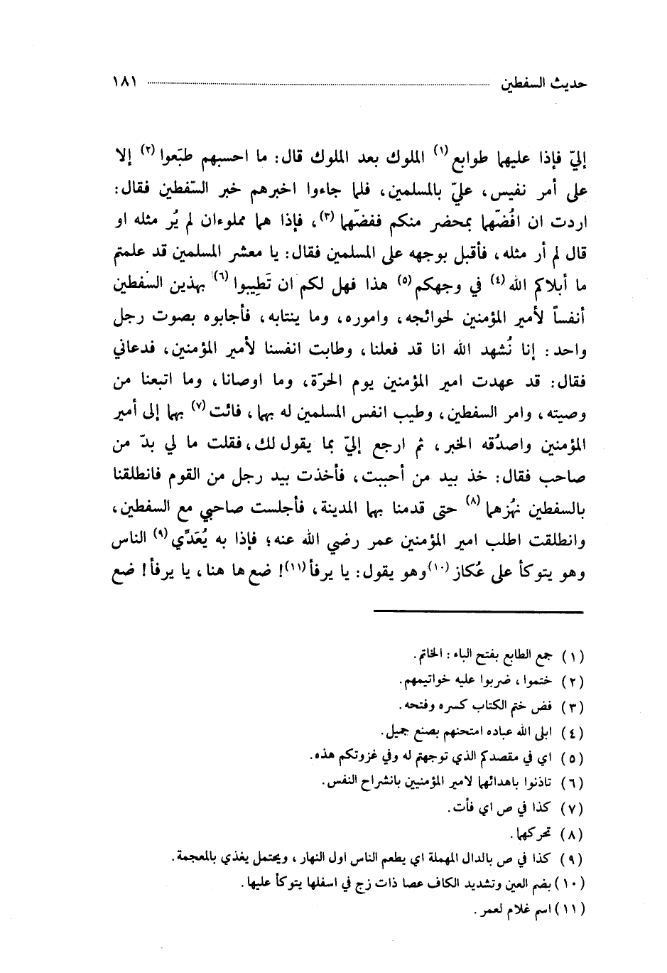 إِلَيَّ ، فَإِذَا عَلَيْهِمَا طَوَابِعُ الْمُلُوكِ بَعْدَ الْمُلُوكِ قَالَ : مَا أَحْسَبُهُمْ طَبَعُوا إِلاَّ عَلَى أَمْرٍ نَفِيسٍ ، عَلَيَّ بِالْمُسْلِمِينَ ، فَلَمَّا جَاؤُوا أَخْبَرَهُمْ خَبَرَ السَّفَطَيْنِ ، فَقَالَ : أَرَدْتُ أَنْ أَفُضَّهُمَا بِمَحْضَرٍ مِنْكُمْ ، فَفَضَّهُمَا ، فَإِذَا هُمَا مَمْلُوءَانِ بِمَا لَمْ يُرَ مِثْلُهُ أَوْ قَالَ : لَمْ أَرَ مِثْلَهُ ، فَأَقْبَلَ بِوَجْهِهِ عَلَى الْمُسْلِمِينَ ، فَقَالَ : يَا مَعْشَرَ الْمُسْلِمِينَ ، قَدْ عَلِمْتُمْ مَا أَبْلاَكُمُ اللَّهُ فِي وَجْهِكُمْ هَذَا ، فَهَلْ لَكُمْ أَنْ تَطِيبُوا بِهَذَيْنِ السَّفَطَيْنِ أَنْفُسًا لأَمِيرِ الْمُؤْمِنِينَ لِحَوَائِجِهِ وَأُمُورِهِ وَمَا يَنْتَابُهُ ، فَأَجَابُوهُ بِصَوْتِ رَجُلٍ وَاحِدٍ : إِنَّا نُشْهِدُ اللَّهَ أَنَّا قَدْ فَعَلْنَا ، وَطَابَتْ أَنْفُسُنَا لأَمِيرِ الْمُؤْمِنِينِ ، فَدَعَانِي ، فَقَالَ : قَدْ عَهِدْتَ أَمِيرَ الْمُؤْمِنِينَ يَوْمَ الْحَرَّةِ ، وَمَا أَوْصَانَا ، وَمَا اتَّبَعْنَا مِنْ وَصِيَّتِهِ وَأَمْرِ السَّفَطَيْنِ ، وَطِيبِ أَنْفُسِ الْمُسْلِمِينَ لَهُ بِهِمَا ، فَأْتِ بِهِمَا إِلَى أَمِيرِ الْمُؤْمِنِينَ ، وَاصْدُقْهُ الْخَبَرَ ، ثُمَّ ارْجِعْ إِلَيَّ بِمَا يَقُولُ لَكَ ، فَقُلْتُ : مَا لِي بُدٌّ مِنْ صَاحِبٍ ، فَقَالَ : خُذْ بِيَدِ مَنْ أَحْبَبْتَ . فَأَخَذْتُ بِيَدِ رَجُلٍ مِنَ الْقَوْمِ ، فَانْطَلَقْنَا بِالسَّفَطَيْنِ نَهُزُّهُمَا حَتَّى قَدِمْنَا بِهِمَا الْمَدِينَةَ ، فَأَجْلَسْتُ صَاحِبِي مَعَ السَّفَطَيْنِ ، وَانْطَلَقْتُ أَطْلُبُ أَمِيرَ الْمُؤْمِنِينَ عُمَرَ رَضِيَ اللَّهُ عَنْهُ ، فَإِذَا بِهِ يُغَدِّي النَّاسَ وَهُوَ يَتَوَكَّأُ عَلَى عُكَّازٍ وَهُوَ يَقُولُ : يَا يَرْفَأُ ، ضَعْ هَاهُنَا ، يَا يَرْفَأُ ، ضَعْ