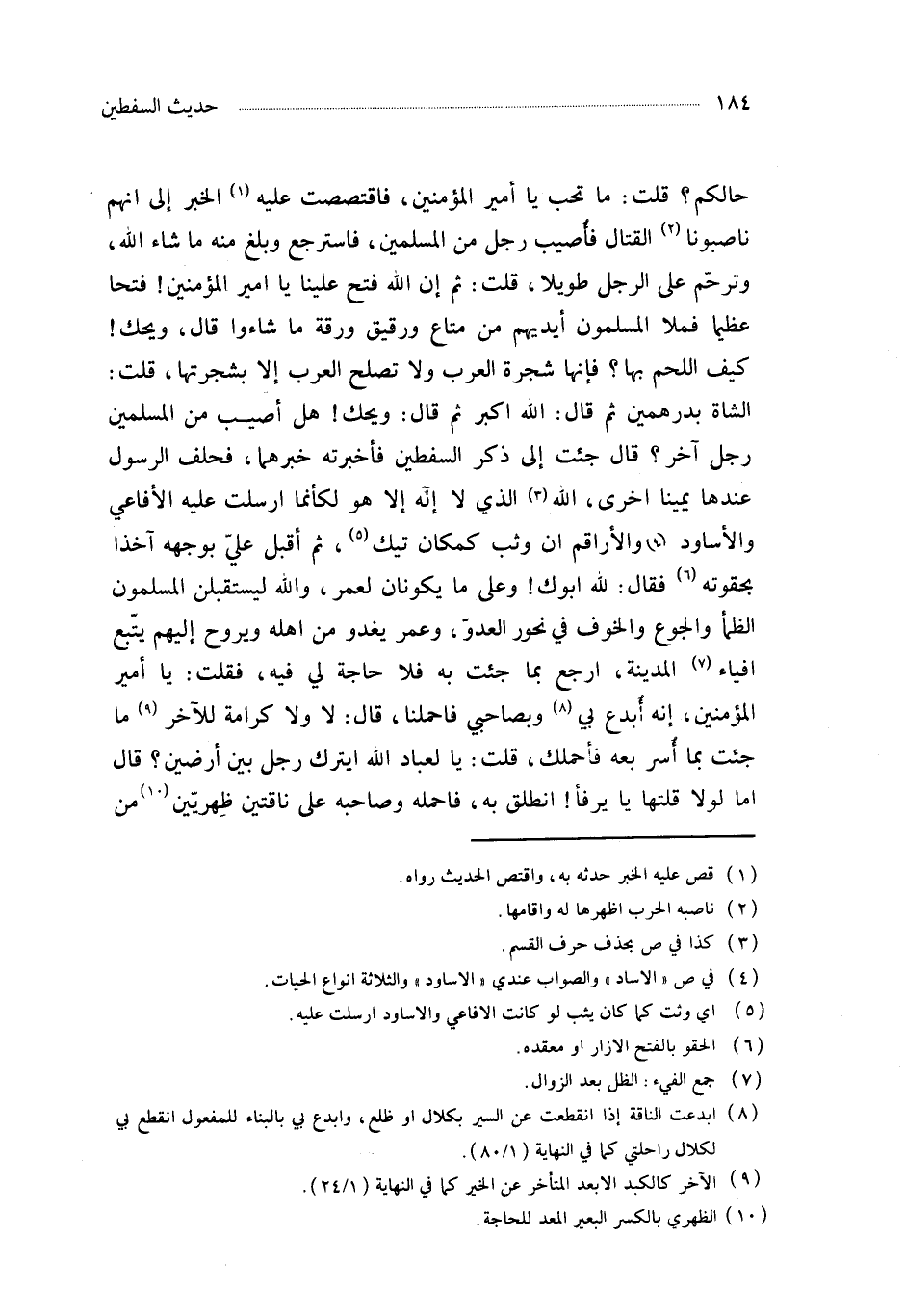 حَالُكُمْ ؟ قُلْتُ : مَا تُحِبُّ يَا أَمِيرَ الْمُؤْمِنِينَ ، فَاقْتَصَصْتُ عَلَيْهِ الْخَبَرَ إِلَى أَنَّهُمْ نَاصَبُونَا الْقِتَالَ ، فَأُصِيبَ رَجُلٌ مِنَ الْمُسْلِمِينَ ، فَاسْتَرْجَعَ وَبَلَغَ مِنْهُ مَا شَاءَ اللَّهُ ، وَتَرَحَّمَ عَلَى الرَّجُلِ طَوِيلاً ، قُلْتُ : ثُمَّ إِنَّ اللَّهَ فَتَحَ عَلَيْنَا يَا أَمِيرَ الْمُؤْمِنِينَ فَتْحًا عَظِيمًا فَمَلأَ الْمُسْلِمُونَ أَيْدِيَهُمْ مِنْ مَتَاعٍ وَرَقِيقٍ وَرِقَةٍ مَا شَاؤُوا قَالَ ، وَيْحَكَ كَيْفَ اللَّحْمُ بِهَا ؟ فَإِنَّهَا شَجَرَةُ الْعَرَبِ ، وَلاَ تَصْلُحُ الْعَرَبُ إِلاَّ بِشَجَرَتِهَا ، قُلْتُ : الشَّاةُ بِدِرْهَمَيْنِ ، ثُمَّ قَالَ : اللَّهُ أَكْبَرُ ، ثُمَّ قَالَ : وَيْحَكَ هَلْ أُصِيبَ مِنَ الْمُسْلِمِينَ رَجُلٌ آخَرُ ؟ قَالَ : جِئْتُ إِلَى ذِكْرِ السَّفَطَيْنِ ، فَأَخْبَرْتُهُ خَبَرَهُمَا ، فَحَلَفَ الرَّسُولُ عِنْدَهَا يَمِينًا أُخْرَى ، اللَّهُ الَّذِي لاَ إِلَهَ إِلاَّ هُوَ لَكَأَنَّمَا أُرْسِلَتْ عَلَيْهِ الأَفَاعِي وَالأَسَاوِدُ وَالأَرَاقِمُ أَنْ وَثَبَ كَمَكَانِ تِيكَ ، ثُمَّ أَقْبَلَ عَلَيَّ بِوَجْهِهِ آخِذًا بِحَقْوَتِهِ فَقَالَ : لِلَّهِ أَبُوكَ وَعَلاَمَ يَكُونَانِ لِعُمَرَ ؟ وَاللَّهِ لَيَسْتَقْبِلَنَّ الْمُسْلِمُونَ الظَّمَأَ وَالْجُوعَ وَالْخَوْفَ فِي نُحُورِ الْعَدُوِّ ، وَعُمَرُ يَغْدُو مِنْ أَهْلِهِ وَيَرُوحُ إِلَيْهِمْ يَتَّبِعُ أَفْيَاءَ الْمَدِينَةِ ، ارْجِعْ بِمَا جِئْتَ بِهِ فَلاَ حَاجَةَ لِي فِيهِ ، فَقُلْتُ : يَا أَمِيرَ الْمُؤْمِنِينَ ، إِنَّهُ أُبْدِعَ بِي وَبِصَاحِبِي فَاحْمِلْنَا قَالَ : لاَ ، وَلاَ كَرَامَةَ لِلآخِرِ مَا جِئْتَ بِمَا أُسَرُّ بِعْهُ فَأَحْمِلَكَ ، قُلْتُ : يَا لَعِبَادِ اللهِ أَيُتْرَكُ رَجُلٌ بَيْنَ أَرْضَيْنِ ؟ قَالَ : أَمَا لَوْلاَ قُلْتَهَا يَا يَرْفَأُ انْطَلِقْ بِهِ فَاحْمِلْهُ وَصَاحِبَهُ عَلَى نَاقَتَيْنِ ظِهْرِيَّيْنِ مِنْ
