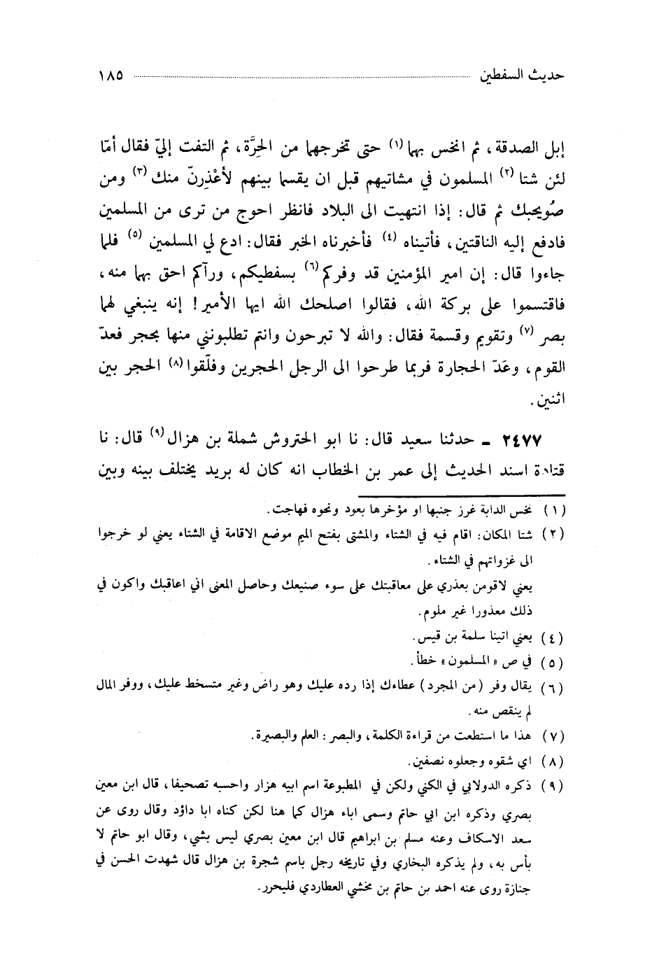 2477- حَدَّثَنَا أَبُو الْحَتْرُوشِ شَمْلَةُ بْنُ هَزَّالٍ قَالَ : حَدَّثَنَا قَتَادَةُ ، أَسْنَدَ الْحَدِيثَ إِلَى عُمَرَ بْنِ الْخَطَّابِ أَنَّهُ كَانَ لَهُ بَرِيدٌ يَخْتَلِفُ بَيْنَهُ وَبَيْنَ مَلَكِ الرُّومِ ، وَأَنَّ امْرَأَةَ عُمَرَ رَضِيَ اللَّهُ عَنْهُ اسْتَقْرَضَتْ دِينَارًا ، فَاشْتَرَتْ بِهِ عِطْرًا ، فَجَعَلَتْ فِي قَوَارِيرَ ، فَبَعَثَتْ بِهِ مَعَ الْبَرِيدِ إِلَى امْرَأَةِ مَلِكِ الرُّومِ ، فَمَا أَتَاهَا بِهِ فَرَّغَتْهُنَّ ، وَمَلأَتْهُنَّ جَوْهَرًا ، وَقَالَتْ : اذْهَبْ بِهِ إِلَى امْرَأَةِ أَمِيرِ الْمُؤْمِنِينَ عُمَرَ ، فَلَمَّا أَتَاهَا بِهِ فَرَّغَتْهُنَّ عَلَى بِسَاطٍ لَهَا ، فَدَخَلَ عُمَرُ عَلَى تَفِيئَةِ ذَلِكَ ، فَقَالَ : مَا هَذَا يَا هَذِهِ ؟ قَالَتْ : إِنِّي اسْتَقْرَضْتُ مِنْ فُلاَنٍ دِينَارًا ، فَاشْتَرَيْتُ بِهِ عِطْرًا ، فَجَعَلْتُهُ فِي قَوَارِيرَ ، وَبَعَثْتُ بِهِ - تَعْنِي مَعَ بَرِيدِكَ - إِلَى امْرَأَةِ مَلِكِ الرُّومِ فَأَرْسَلَتْ بِهِ إِلَيَّ ، فَقَالَ عُمَرُ عِنْدَ ذَلِكَ : يَا فُلاَنُ خُذْ هَذَا فَاذْهَبْ بِهِ ، فَبِعْهُ ، فَاقْضِ بِهِ فُلاَنًا دِينَارًا ، وَاجْعَلْ بَقِيَّتَهُ فِي بَيْتِ مَالِ الْمُسْلِمِينَ ، لَيْسَ آلُ عُمَرَ أَحَقَّ بِهِ مِنَ الْمُسْلِمِينَ.