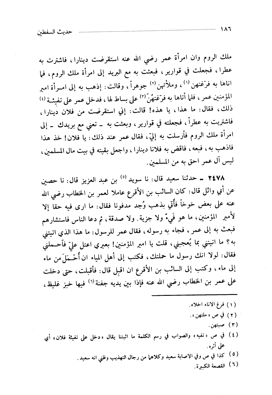 2478- حَدَّثَنَا سُوَيْدُ بْنُ عَبْدِ الْعَزِيزِ ، قَالَ : حَدَّثَنَا حُصَيْنٌ ، عَنْ أَبِي وَائِلٍ ، قَالَ : كَانَ السَّائِبُ بْنُ الأَقْرَعِ عَامِلاً لِعُمَرَ بْنِ الْخَطَّابِ رَضِيَ اللَّهُ عَنْهُ عَلَى بَعْضِ خَوْخًا فَأُتِيَ بِذَهَبٍ وُجِدَ مَدْفُونًا فَقَالَ : مَا أَرَى فِيهِ حَقًّا إِلاَّ لأَمِيرِ الْمُؤْمِنِينَ ، مَا هُوَ فَيْءٌ وَلاَ جِزْيَةٌ ، وَلاَ صَدَقَةٌ ، ثُمَّ دَعَا النَّاسَ ، فَاسْتَشَارَهُمْ فَبَعَثَ بِهِ إِلَى عُمَرَ ، فَجَاءَ بِهِ رَسُولُهُ ، فَقَالَ عُمَرُ لِلرَّسُولِ : مَا هَذَا الَّذِي أَتَيْتَنِي بِهِ ؟ مَا أَتَيْتَنِي بِمَا يُعْجِبُنِي ، قُلْتُ : يَا أَمِيرَ الْمُؤْمِنِينَ بَعِيرِي اعْتَلَّ عَلَيَّ فَاحْمِلْنِي ، فَقَالَ : لَوْلاَ أَنَّكَ رَسُولٌ مَا حَمَلْتُكَ ، فَكَتَبَ إِلَى أَهْلِ الْمِيَاهِ : أَنْ أُحْمَلَ مِنْ مَاءٍ إِلَى مَاءٍ ، وَكَتَبَ إِلَى السَّائِبِ بْنِ الأَقْرَعِ : أَنْ أَقْبِلْ , قَالَ : فَأَقْبَلْتُ ، حَتَّى دَخَلْتُ عَلَى عُمَرَ بْنِ الْخَطَّابِ رَضِيَ اللَّهُ عَنْهُ ، فَإِذَا بَيْنَ يَدَيْهِ جَفْنَةٌ فِيهَا خُبْزٌ غَلِيظٌ ، وَكُسُورٌ مِنْ بَعِيرٍه أَعْجَفَ ، فَقَالَ لِي : كُلْ ، فَأَكَلْتُ قَلِيلاً ، ثُمَّ لَمْ أَسْتَطِعْ أَنْ آكُلَ ، فَقَالَ : كُلْ فَلَيْسَ بِدَرْمَكِ الْعِرَاقِ الَّذِي تَأْكُلُ أَنْتَ وَأَصْحَابُكَ ، ثُمَّ قَالَ : انْظُرْ مَنْ بِالْبَابِ ؟ فَقَالُوا : رُعَاةُ الْغَنَمِ ، قَالَ : السُّودَانُ ؟ قَالُوا : نَعَمْ قَالَ : ادْعُوهُمْ ، فَجَعَلُوا يَأْكُلُونَ مَعَهُ حَتَّى إِنِّي لأَنْظُرُ إِلَيْهِمْ يَلْطَعُونَ الْجَفْنَةَ بِأَصَابِعِهِمْ ، ثُمَّ قَالَ : فَدَخَلَ ، فَلَمْ يَذْكُرْ لِي شَيْئًا ، فَأَتَيْتُ مَنْزِلِي ، فَلَمَّا خَرَجَ إِلَى النَّاسِ دَخَلْتُ عَلَيْهِ ، فَقَالَ : مَا هَذَا الَّذِي أَرْسَلْتَ بِهِ إِلَيَّ ؟ فَقُلْتُ : وَجَدْنَاهُ مَالاً مَدْفُونًا ، قُلْتُ : لَيْسَ بفيءٍ ، وَلاَ جِزْيَةٍ ، وَلاَ بِصَدَقَةٍ ، فَقُلْتُ : لَيْسَ لأَحَدٍ فِيهِ حَقٌّ غَيْرَ أَمِيرِ الْمُؤْمِنِينَ ، فَقَالَ : لاَ أَبَا لَكَ ، وَمَا جَعَلَنِي أَحَقَّ بِهِ ، وَأَنَا بِالْمَدِينَةِ وَهُمْ فِي نُحُورِ الْعَدُوِّ ، قُلْتُ : يَا أَمِيرَ الْمُؤْمِنِينَ طَيَّبْتُ ذَلِكَ ، فَقَالَ : أَتَعْرِفُ خَاتَمَ رَسُولِكَ ، فَفَتَحْتُهُ ، فَإِذَا فِيهِ شَيْءٌ عَجِيبٌ ، فَقَالَ : فَإِنِّي أَعْزِمُ عَلَيْكَ إِلاَّ ذَهَبْتَ بِهِ إِلَى الْكُوفَةِ فَقَسَمْتَهُ فَقَالَ أَبُو وَائِلٍ : فَرَأَيْتُ السَّائِبَ يُخْرِجُ قِطَعَ الذَّهَبِ حَتَّى يُعْطِيَ الرَّجُلَ.