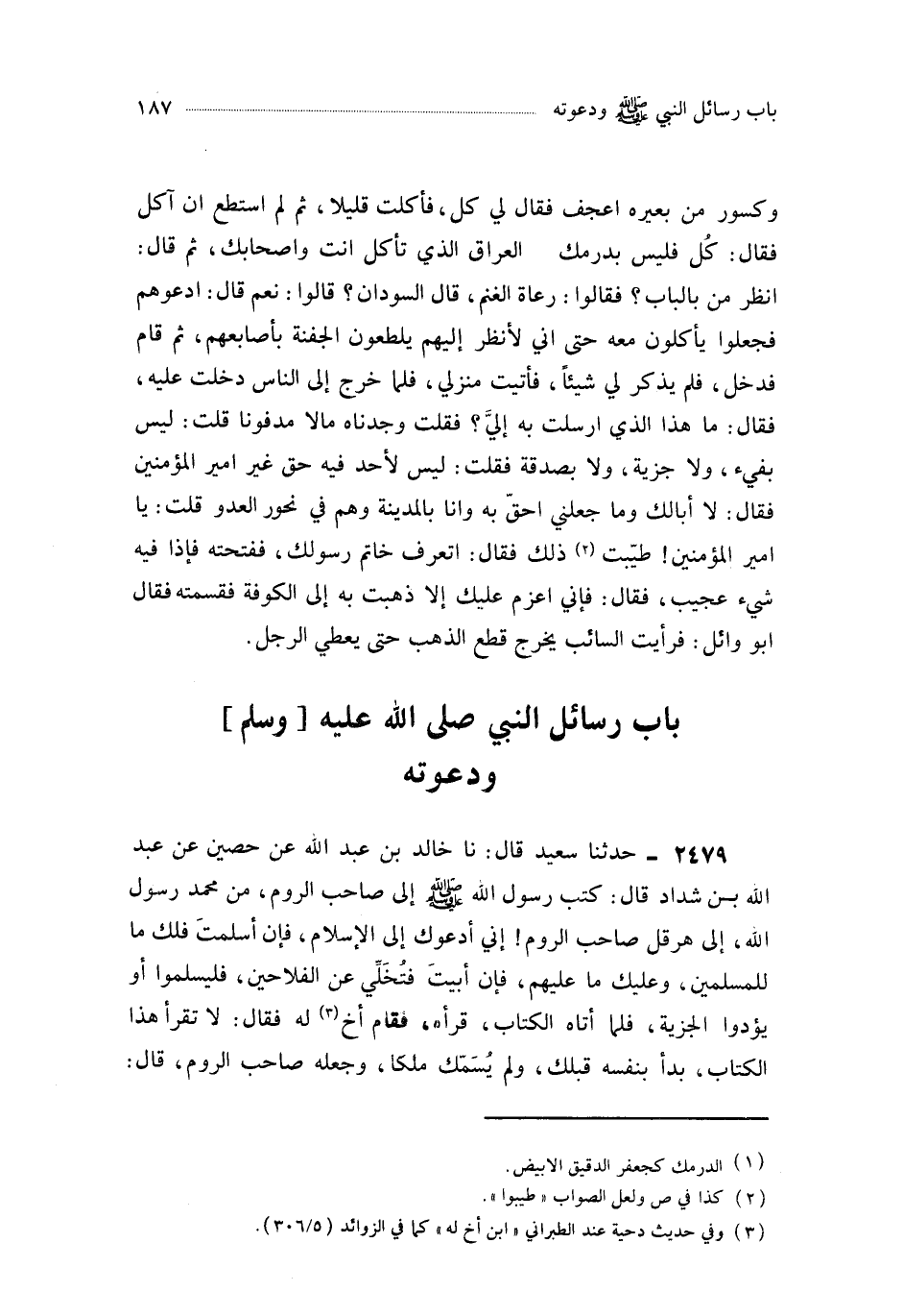 2479- حَدَّثَنَا خَالِدُ بْنُ عَبْدِ اللهِ ، عَنْ حُصَيْنٍ ، عَنْ عَبْدِ اللهِ بْنِ شَدَّادٍ ، قَالَ : كَتَبَ رَسُولُ اللهِ صَلَّى اللَّهُ عَلَيْهِ وَسَلَّمَ إِلَى صَاحِبِ الرُّومِ : مِنْ مُحَمَّدٍ رَسُولِ اللهِ ، إِلَى هِرَقْلَ صَاحِبِ الرُّومِ إِنِّي أَدْعُوكَ إِلَى الإِسْلاَمِ ، فَإِنْ أَسْلَمْتَ فَلَكَ مَا لِلْمُسْلِمِينَ ، وَعَلَيْكَ مَا عَلَيْهِمْ ، فَإِنْ أَبَيْتَ فَتُخَلِّي عَنِ الْفَلاَّحِينَ ، فَلْيُسْلِمُوا أَوْ يُؤَدُّوا الْجِزْيَةَ ، فَلَمَّا أَتَاهُ الْكِتَابُ ، قَرَأَهُ ، فَقَامَ أَخٌ لَهُ فَقَالَ : لاَ تَقْرَأْ هَذَا الْكِتَابَ ، بَدَأَ بِنَفْسِهِ قَبْلَكَ ، وَلَمْ يُسَمِّكَ مَلِكًا ، وَجَعَلَهُ صَاحِبَ الرُّومِ ، قَالَ :