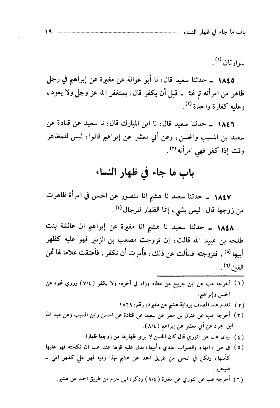1846- حَدَّثَنَا ابْنُ الْمُبَارَكِ ، قَالَ : حَدَّثَنَا سَعِيدٌ ، عَنْ قَتَادَةَ ، عَنْ سَعِيدِ بْنِ الْمُسَيَّبِ وَالْحَسَنِ ، وَعَنْ أَبِي مَعْشَرٍ ، عَنْ إِبْرَاهِيمَ ، قَالُوا : لَيْسَ لِلْمُظَاهِرِ وَقْتٌ إِذَا كَفَّرَ فَهِيَ امْرَأَتُهُ.
