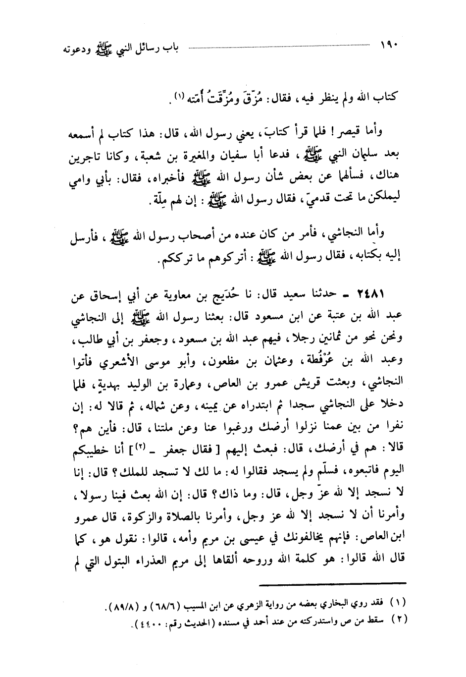 2481- حَدَّثَنَا حُدَيْجُ بْنُ مُعَاوِيَةَ ، عَنْ أَبِي إِسْحَاقَ ، عَنْ عَبْدِ اللهِ بْنِ عُتْبَةَ ، عَنِ ابْنِ مَسْعُودٍ ، قَالَ : بَعَثَنَا رَسُولُ اللهِ صَلَّى اللَّهُ عَلَيْهِ وَسَلَّمَ إِلَى النَّجَاشِيِّ وَنَحْنُ نَحْوٌ مِنْ ثَمَانِينَ رَجُلاً ، فِيهِمْ عَبْدُ اللهِ بْنُ مَسْعُودٍ ، وَجَعْفَرُ بْنُ أَبِي طَالِبٍ ، وَعَبْدُ اللهِ بْنُ عُرْفُطَةَ ، وَعُثْمَانُ بْنُ مَظْعُونٍ ، وَأَبُو مُوسَى الأَشْعَرِيُّ ، فَأَتَوُا النَّجَاشِيَّ ، وَبَعَثَتْ قُرَيْشٌ عَمْرَو بْنَ الْعَاصِ ، وَعُمَارَةَ بْنَ الْوَلِيدِ بِهَدِيَّةٍ ، فَلَمَّا دَخَلاَ عَلَى النَّجَاشِيِّ سَجَدَا ثُمَّ ابْتَدَرَاهُ عَنْ يَمِينِهِ ، وَعَنْ شِمَالِهِ ، ثُمَّ قَالاَ لَهُ : إِنَّ نَفَرًا مِنْ بَنِي عَمِّنَا نَزَلُوا أَرْضَكَ ، وَرَغِبُوا عَنَّا وَعَنْ مِلَّتِنَا ، قَالَ : فَأَيْنَ هُمْ ؟ قَالاَ : هُمْ فِي أَرْضِكَ ، قَالَ : فَبَعَثَ إِلَيْهِمْ ، فَقَالَ جَعْفَرٌ : أَنَا خَطِيبُكُمُ الْيَوْمَ , فَاتَّبَعُوهُ ، فَسَلَّمَ وَلَمْ يَسْجُدْ ، فَقَالُوا لَهُ : مَا لَكَ لاَ تَسْجُدُ لِلْمَلِكِ ؟ قَالَ : إِنَّا لاَ نَسْجُدُ إِلاَّ لِلَّهِ عَزَّ وَجَلَّ قَالَ : وَمَا ذَاكَ ؟ قَالَ : إِنَّ اللَّهَ بَعَثَ فِينَا رَسُولاً ، وَأَمَرَنَا أَنْ لاَ نَسْجُدَ إِلاَّ لِلَّهِ عَزَّ وَجَلَّ ، وَأَمَرَنَا بِالصَّلاَةِ وَالزَّكَاةِ ، قَالَ عَمْرُو بْنُ الْعَاصِ : فَإِنَّهُمْ يُخَالِفُونَكَ فِي عِيسَى ابْنِ مَرْيَمَ وَأُمِّهِ ، قَالُوا : نَقُولُ : هُوَ كَمَا قَالَ اللَّهُ ، قَالُوا : هُوَ كَلِمَةُ اللهِ وَرُوحُهُ أَلْقَاهَا إِلَى مَرْيَمَ الْعَذْرَاءِ الْبَتُولِ الَّتِي لَمْ يَمَسَّهَا بَشَرٌ وَلَمْ يَفْرِضْهَا وَلَدٌ قَالَ : فَرَفَعَ عُودًا مِنَ الأَرْضِ ثُمَّ قَالَ : يَا مَعْشَرَ الْحَبَشَةِ وَالْقِسِّيسِينَ وَالرُّهْبَانِ وَاللَّهِ مَا يَزِيدُونَ عَلَى مَا نَقُولُ فِيهِ مَا يَسْوَى هَذَا ، مَرْحَبًا بِكُمْ وَبِمَنْ جِئْتُمْ مِنْ عِنْدِهِ ، أَشْهَدُ أَنَّهُ رَسُولُ اللهِ صَلَّى اللَّهُ عَلَيْهِ وَسَلَّمَ ، وَأَنَّهُ الَّذِي نَجِدُهُ فِي الإِنْجِيلِ ، وَأَنَّهُ الَّذِي بَشَّرَ بِهِ عِيسَى ابْنُ مَرْيَمَ ، فَانْزِلُوا حَيْثُ شِئْتُمْ ، وَاللَّهِ لَوْلاَ مَا أَنَا فِيهِ مِنَ الْمُلْكِ لأَتَيْتُهُ ، حَتَّى أَكُونَ أَنَا الَّذِي أَحْمِلُ نَعْلَيْهِ ، وَأُوَضِّئُهُ ، وَأَمَرَ بِهَدِيَّةِ الآخَرِينَ فَرُدَّتْ إِلَيْهِمَا ، ثُمَّ تَعَجَّلَ عَبْدُ اللهِ بْنُ مَسْعُودٍ حَتَّى أَدْرَكَ بَدْرًا ، وَزَعَمَ أَنَّ رَسُولَ اللهِ صَلَّى اللَّهُ عَلَيْهِ وَسَلَّمَ اسْتَغْفَرَ لَهُ حِينَ بَلَغَهُ مَوْتُهُ.