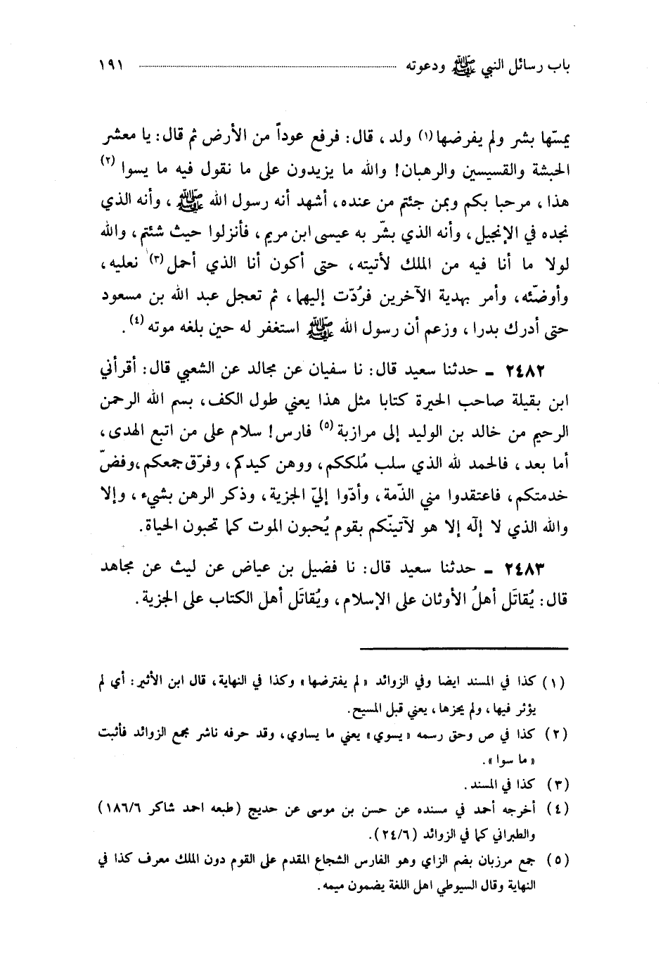 2482- حَدَّثَنَا سُفْيَانُ ، عَنْ مُجَالِدٍ ، عَنِ الشَّعْبِيِّ ، قَالَ : أَقْرَأَنِي ابْنُ بُقَيْلَةَ صَاحِبُ الْحِيرَةِ كِتَابًا مِثْلَ هَذَا - يَعْنِي طُولَ الْكَفِّ - : بِسْمِ اللهِ الرَّحْمَنِ الرَّحِيمِ مِنْ خَالِدِ بْنِ الْوَلِيدِ إِلَى مَرَازِبَةِ فَارِسَ سَلاَمٌ عَلَى مَنِ اتَّبَعَ الْهُدَى ، أَمَا بَعْدُ ، فَالْحَمْدُ لِلَّهِ الَّذِي سَلَبَ مُلْكَكُمْ ، وَوَهَّنَ كَيْدَكُمْ ، وَفَرَّقَ جَمْعَكُمْ ، وَفَضَّ خِدْمَتَكُمْ ، فَاعْتَقِدُوا مِنِّيَ الذِّمَّةَ ، وَأَدُّوا إِلَيَّ الْجِزْيَةَ ، وَذَكَرَ الرَّهْنَ بِشَيْءٍ ، وَإِلاَّ وَاللَّهِ الَّذِي لاَ إِلَهَ إِلاَّ هُوَ لَآتِيَنَّكُمْ بِقَوْمٍ يُحِبُّونَ الْمَوْتَ كَمَا تُحِبُّونَ الْحَيَاةَ.
