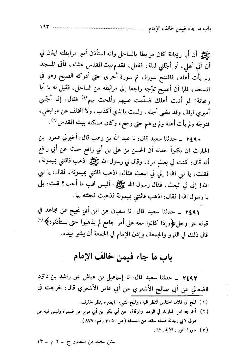 2492- حَدَّثَنَا إِسْمَاعِيلُ بْنُ عَيَّاشٍ ، عَنْ رَاشِدِ بْنِ دَاوُدَ الصَّنْعَانِيِّ (1)، عَنْ أَبِي صَالِحٍ الأَشْعَرِيِّ ، عَنْ أَبِي عَامِرٍ الأَشْعَرِيِّ ، قَالَ : خَرَجْتُ فِي سَرِيَّةٍ ، وَمَعَنَا سَعْدُ بْنُ أَبِي وَقَّاصٍ ، فَنَزَلْنَا مَنْزِلاً ، فَقَالَ فَتًى مِنَّا : إِنِّي أُرِيدُ التَّعَلُّفَ ، فَقَالَ لَهُ ابْنُ عَامِرٍ : لاَ تَفْعَلْ حَتَّى تَسْتَأْمِرَ صَاحِبَنَا ، يَعْنِي أَبَا مُوسَى الأَشْعَرِيَّ ، وَهُمْ رُفْقَةٌ فَاسْتَأْذَنَهُ ، فَقَالَ لَهُ أَبُو مُوسَى لَعَلَّكَ تُرِيدُ أَهْلَكَ قَالَ : لاَ ، قَالَ : انْظُرْ قَالَ : لاَ ، قَالَ : فَانْطَلَقَ الْفَتَى فَأَتَى أَهْلَهُ ، فَأَقَامَ عِنْدَهُمْ أَرْبَعَ لَيَالٍ ، ثُمَّ قَدِمَ فَسَأَلَهُ أَبُو مُوسَى ، وَقَالَ : أَتَيْتَ أَهْلَكَ ؟ قَالَ : مَا فَعَلْتُ ، قَالَ أَبُو مُوسَى : لَتُخْبِرَنِّي قَالَ : مَا فَعَلْتُ ، قَالَ : لَتَصْدُقَنِّي قَالَ : قَدْ فَعَلْتُ ، فَقَالَ لَهُ أَبُو مُوسَى : فَإِنَّكَ سِرْتَ فِي النَّارِ ، وَوَقَعْتَ فِي أَهْلِكَ فِي النَّارِ ، وَأَقْبَلْتَ فِي النَّارِ ، فَاسْتَأْنِفِ الْعَمَلَ.