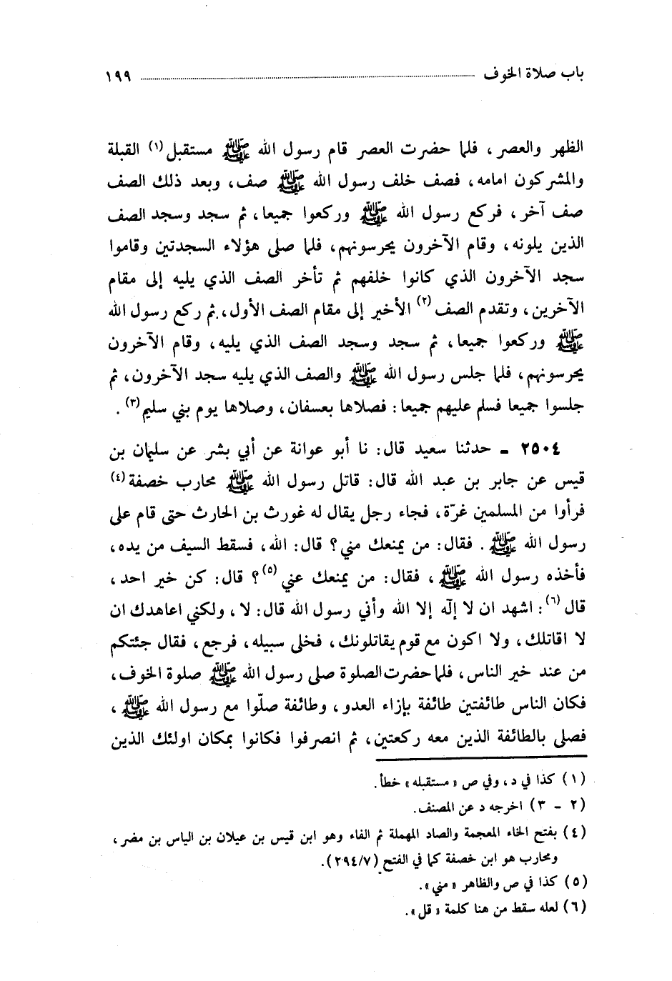 2504- حَدَّثَنَا أَبُو عَوَانَةَ ، عَنْ أَبِي بِشْرٍ ، عَنْ سُلَيْمَانَ بْنِ قَيْسٍ ، عَنْ جَابِرِ بْنِ عَبْدِ اللهِ ، قَالَ : قَاتَلَ رَسُولُ اللهِ صَلَّى اللَّهُ عَلَيْهِ وَسَلَّمَ مُحَارِبَ خَصَفَةَ ، فَرَأَوْا مِنَ الْمُسْلِمِينَ غِرَّةً ، فَجَاءَ رَجُلٌ يُقَالُ لَهُ غَوْرَثُ بْنُ الْحَارِثِ حَتَّى قَامَ عَلَى رَسُولِ اللهِ صَلَّى اللَّهُ عَلَيْهِ وَسَلَّمَ ، فَقَالَ : مَنْ يَمْنَعُكَ مِنِّي ؟ قَالَ : اللَّهُ فَسَقَطَ السَّيْفُ مِنْ يَدِهِ ، فَأَخَذَهُ رَسُولُ اللهِ صَلَّى اللَّهُ عَلَيْهِ وَسَلَّمَ ، فَقَالَ : مَنْ يَمْنَعُكَ عَنِّي ؟ قَالَ : كُنْ خَيْرَ آحدٍ ، قَالَ : اشْهَدْ أَنْ لاَ إِلَهَ إِلاَّ اللَّهُ وَأَنِّي رَسُولُ اللهِ قَالَ : لاَ ، وَلَكِنِّي أُعَاهِدُكَ أَنْ لاَ أُقَاتِلَكَ ، وَلاَ أَكُونُ مَعَ قَوْمٍ يُقَاتِلُونَكَ ، فَخَلَّى سَبِيلَهُ ، فَرَجَعَ ، فَقَالَ : جِئْتُكُمْ مِنْ عِنْدِ خَيْرِ النَّاسِ ، فَلَمَّا حَضَرَتِ الصَّلاَةُ صَلَّى رَسُولُ اللهِ صَلَّى اللَّهُ عَلَيْهِ وَسَلَّمَ صَلاَةَ الْخَوْفِ ، فَكَانَ النَّاسُ طَائِفَتَيْنِ : طَائِفَةٌ بِإِزَاءِ الْعَدُوِّ ، وَطَائِفَةٌ صَلَّوْا مَعَ رَسُولِ اللهِ صَلَّى اللَّهُ عَلَيْهِ وَسَلَّمَ ، فَصَلَّى بِالطَّائِفَةِ الَّذِينَ مَعَهُ رَكْعَتَيْنِ ، ثُمَّ انْصَرَفُوا ، فَكَانُوا بِمَكَانِ أُولَئِكَ الَّذِينَ بِإِزَاءِ عَدُوِّهِمْ ، وَانْصَرَفَ أُولَئِكَ الَّذِينَ كَانُوا بِإِزَاءِ عَدُوِّهِمْ ، فَصَلَّوْا مَعَ رَسُولِ اللهِ صَلَّى اللَّهُ عَلَيْهِ وَسَلَّمَ رَكْعَتَيْنِ ، فَكَانَ لِرَسُولِ اللهِ صَلَّى اللَّهُ عَلَيْهِ وَسَلَّمَ أَرْبَعُ رَكَعَاتٍ وَلِلْقَوْمِ رَكْعَتَيْنِ رَكْعَتَيْنِ