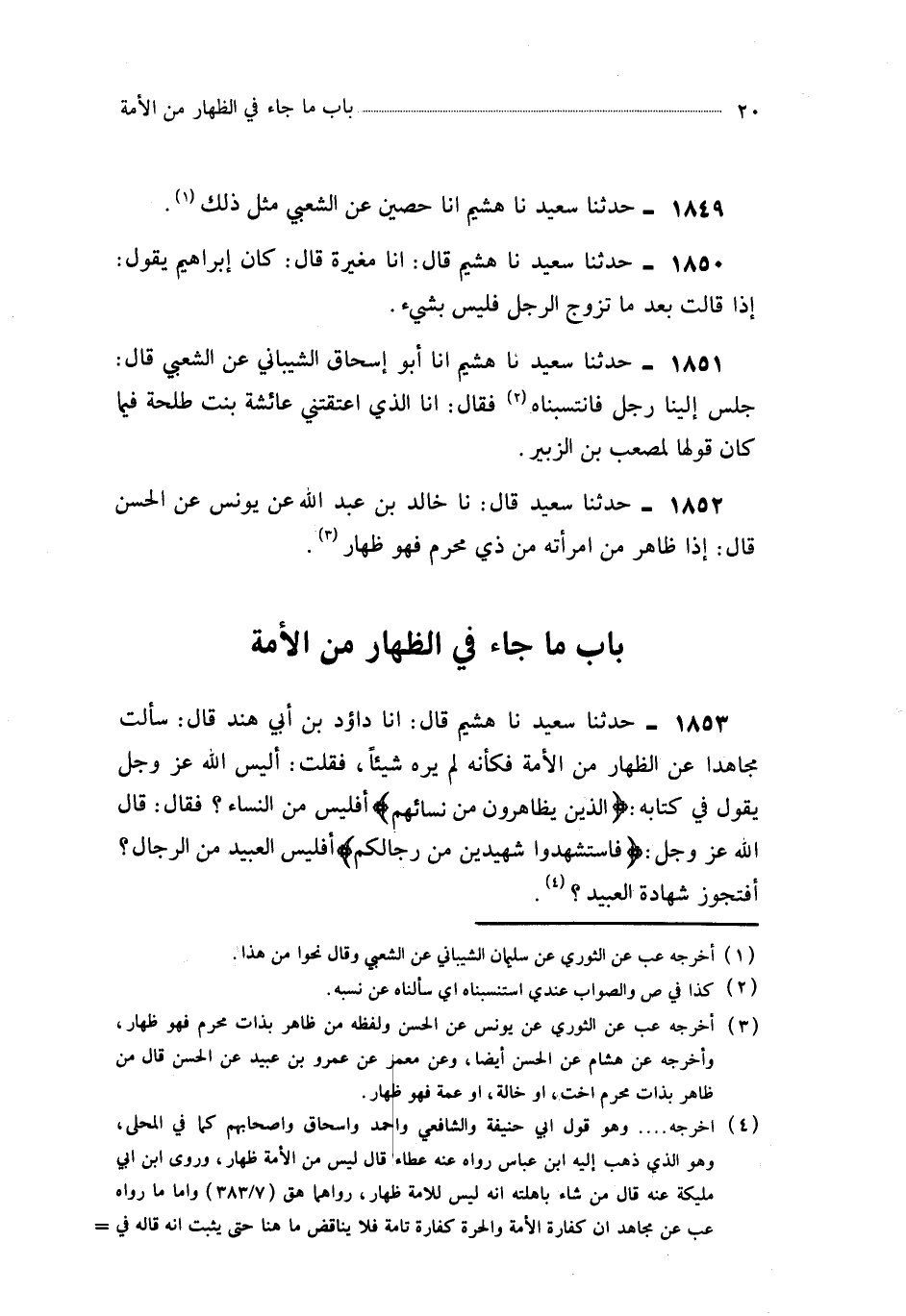 1853- حَدَّثَنَا هُشَيْمٌ ، قَالَ : أَخْبَرَنَا دَاوُدُ بْنُ أَبِي هِنْدَ ، قَالَ : سَأَلْتُ مُجَاهِدًا عَنِ الظِّهَارِ مِنَ الأَمَةِ فَكَأَنَّهُ لَمْ يَرَهُ شَيْئًا ، فَقُلْتُ : أَلَيْسَ اللَّهُ عَزَّ وَجَلَّ يَقُولُ فِي كِتَابِهِ : {الَّذِينَ يُظَاهِرُونَ مِنْ نِسَائِهِمْ} أَفَلَيْسَ مِنَ النِّسَاءِ ؟ فَقَالَ : قَالَ اللَّهُ عَزَّ وَجَلَّ : {وَاسْتَشْهِدُوا شَهِيدَيْنِ مِنْ رِجَالِكُمْ} أَفَلَيْسَ الْعَبِيدُ مِنَ الرِّجَالِ ؟ أَفَتَجُوزُ شَهَادَةُ الْعَبِيدِ ؟.