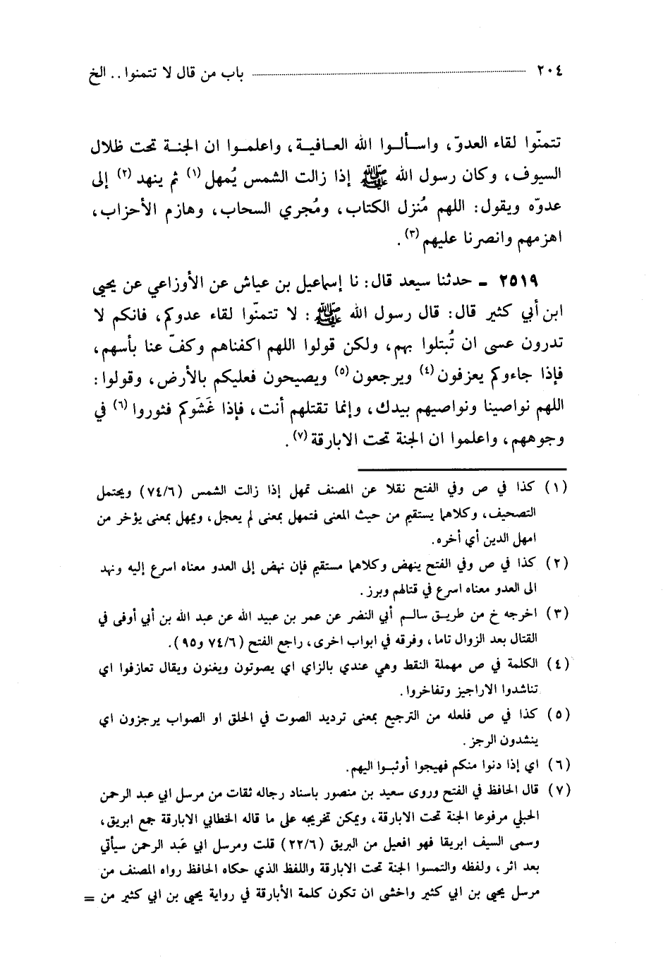 2519- حَدَّثَنَا إِسْمَاعِيلُ بْنُ عَيَّاشٍ ، عَنِ الأَوْزَاعِيِّ ، عَنْ يَحْيَى بْنِ أَبِي كَثِيرٍ ، قَالَ : قَالَ رَسُولُ اللهِ صَلَّى اللَّهُ عَلَيْهِ وَسَلَّمَ : لاَ تَتَمَنَّوْا لِقَاءَ عَدُوِّكُمْ ، فَإِنَّكُمْ لاَ تَدْرُونَ عَسَى أَنْ تُبْتَلَوْا بِهِمْ ، وَلَكِنْ قُولُوا : اللَّهُمَّ اكْفِنَاهُمْ وَكُفَّ عَنَّا بَأْسَهُمْ ، فَإِذَا جَاؤُوكُمْ يَعْزِفُونَ وَيُرَجِّعُونَ وَيَصِيحُونَ ، فَعَلَيْكُمْ بِالأَرْضِ ، وَقُولُوا : اللَّهُمَّ نَوَاصِينَا وَنَوَاصِيهِمْ بِيَدِكِ ، وَإِنَّمَا تَقْتُلُهُمْ أَنْتَ ، فَإِذَا غَشَوْكُمْ فَثُورُوا فِي وُجُوهِهِمْ ، وَاعْلَمُوا أَنَّ الْجَنَّةَ تَحْتَ الأَبَارِقَةِ.