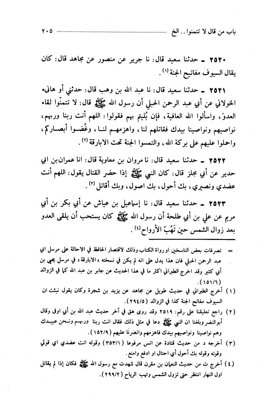 2521- حَدَّثَنَا عَبْدُ اللهِ بْنُ وَهْبٍ ، قَالَ : حَدَّثَنِي أَبُو هَانِئٍ الْخَوْلاَنِيُّ ، عَنْ أَبِي عَبْدِ الرَّحْمَنِ الْحُبُلِيِّ ، أَنَّ رَسُولَ اللهِ صَلَّى اللَّهُ عَلَيْهِ وَسَلَّمَ قَالَ : لاَ تَتَمَنَّوْا لِقَاءَ الْعَدُوِّ ، وَاسْأَلُوا اللَّهَ الْعَافِيَةَ ، فَإِنْ بُلِيتُمْ بِهِمْ فَقُولُوا : اللَّهُمَّ أَنْتَ رَبُّنَا وَرَبُّهُمْ نَوَاصِيهِمْ وَنَوَاصِينَا بِيَدِكَ فَقَاتِلْهُمْ لَنَا ، وَاهْزِمْهُمْ لَنَا ، وَغُضُّوا أَبْصَارَكُمْ ، وَاحْمِلُوا عَلَيْهِمْ عَلَى بَرَكَةِ اللهِ ، وَالْتَمِسُوا الْجَنَّةَ تَحْتَ الأَبَارِقَةِ.