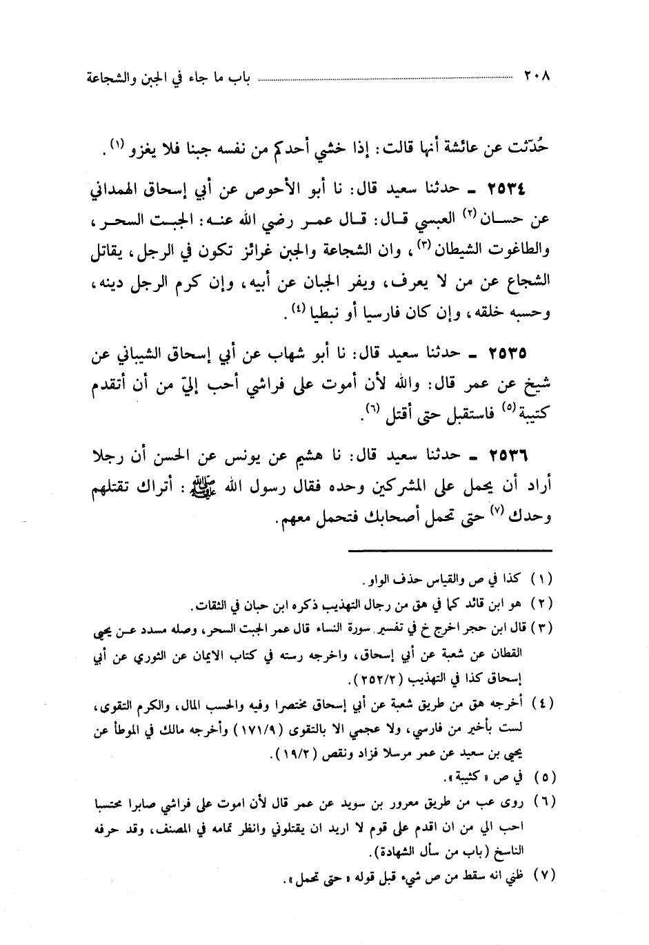 2535- حَدَّثَنَا أَبُو شِهَابٍ ، عَنْ أَبِي إِسْحَاقَ الشَّيْبَانِيِّ ، عَنْ شَيْخٍ ، عَنْ عُمَرَ ، قَالَ : وَاللَّهِ لأَنْ أَمُوتَ عَلَى فِرَاشِي أَحَبُّ إِلَيَّ مِنْ أَنْ أَتَقَدَّمُ كَتِيبَةً فَأُسْتَقْبَلَ حَتَّى أُقْتَلَ.