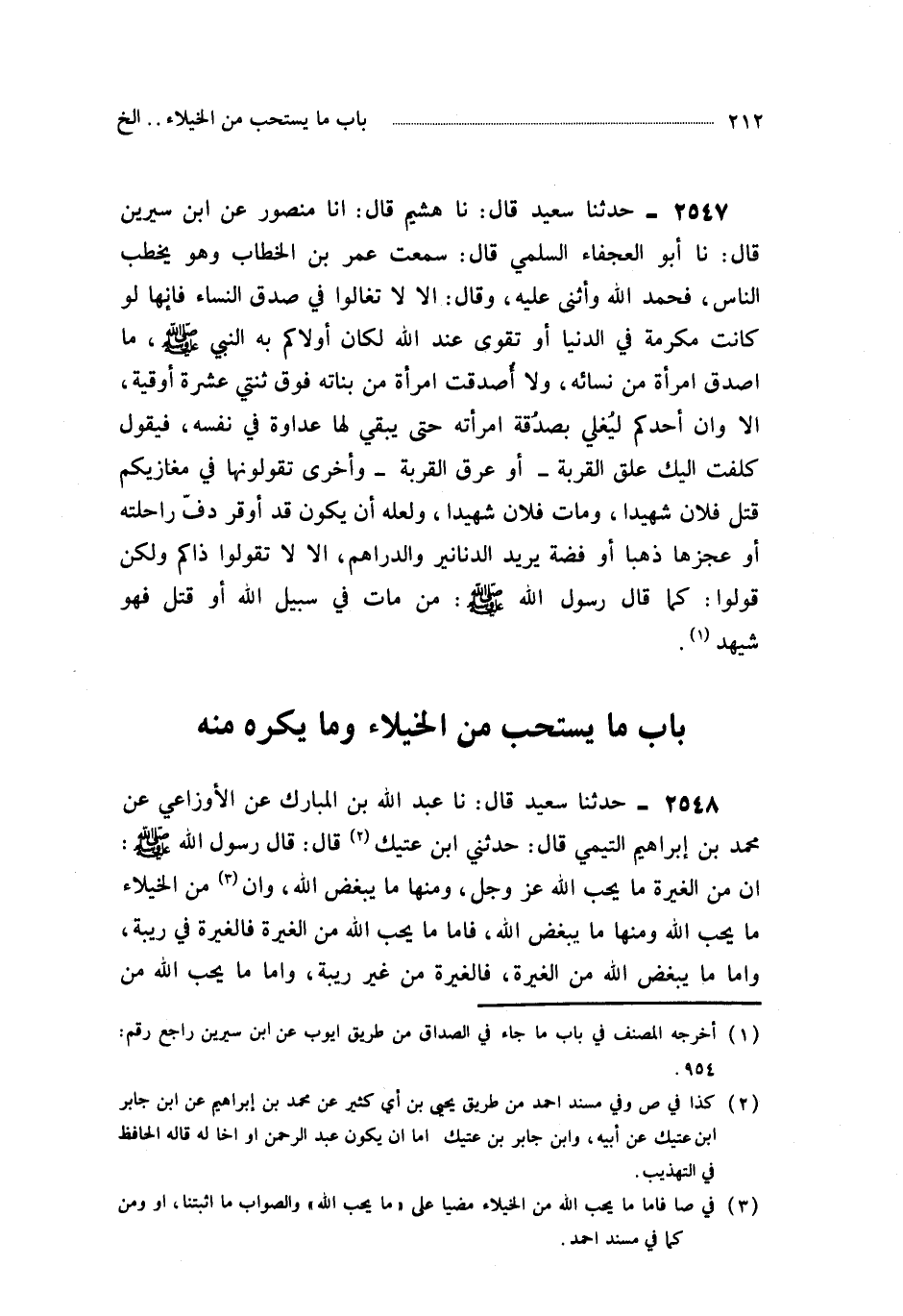 2547- حَدَّثَنَا هُشَيْمٌ ، قَالَ : أَخْبَرَنَا مَنْصُورٌ ، عَنِ ابْنِ سِيرِينَ ، قَالَ : حَدَّثَنَا أَبُو الْعَجْفَاءِ السُّلَمِيُّ ، قَالَ : سَمِعْتُ عُمَرَ بْنَ الْخَطَّابِ ، وَهُوَ يَخْطُبُ النَّاسَ ، فَحَمِدَ اللَّهَ وَأَثْنَى عَلَيْهِ ، وَقَالَ : أَلاَ لاَ تُغَالُوا فِي صُدُقِ النِّسَاءِ ، فَإِنَّهَا لَوْ كَانَتْ مَكْرُمَةً فِي الدُّنْيَا أَوْ تَقْوًى عِنْدَ اللهِ لَكَانَ أَوْلاَكُمْ بِهِ النَّبِيُّ صَلَّى اللَّهُ عَلَيْهِ وَسَلَّمَ ، مَا أَصْدَقَ امْرَأَةً مِنْ نِسَائِهِ ، وَلاَ أُصْدِقَتِ امْرَأَةٌ مِنْ بَنَاتِهِ فَوْقَ ثِنْتَيْ عَشْرَةَ أُوقِيَّةً ، أَلاَ وَإِنَّ أَحَدَكُمْ لَيُغْلِي بِصَدُقَةِ امْرَأَتِهِ حَتَّى يُبْقِيَ لَهَا عَدَاوَةً فِي نَفْسِهِ ، فَيَقُولُ كَلَّفْتُ إِلَيْكَ عَلَقَ الْقِرْبَةِ - أَوْ عَرَقَ الْقِرْبَةِ - وَأُخْرَى تَقُولُونَهَا فِي مَغَازِيكُمْ ، قُتِلَ فُلاَنٌ شَهِيدًا ، وَمَاتَ فُلاَنٌ شَهِيدًا ، وَلَعَلَّهُ أَنْ يَكُونَ قَدْ أَوْقَرَ دَفَّ رَاحِلَتِهِ أَوْ عَجُزَهَا ذَهَبًا أَوْ فِضَّةٍ يُرِيدَ الدَّنَانِيرَ وَالدَّرَاهِمَ ، أَلاَ لاَ تَقُولُوا ذَاكُمْ ، وَلَكِنْ قُولُوا : كَمَا قَالَ رَسُولُ اللهِ صَلَّى اللَّهُ عَلَيْهِ وَسَلَّمَ : مَنْ مَاتَ فِي سَبِيلِ اللهِ أَوْ قُتِلَ فَهُوَ شَهِيدٌ.