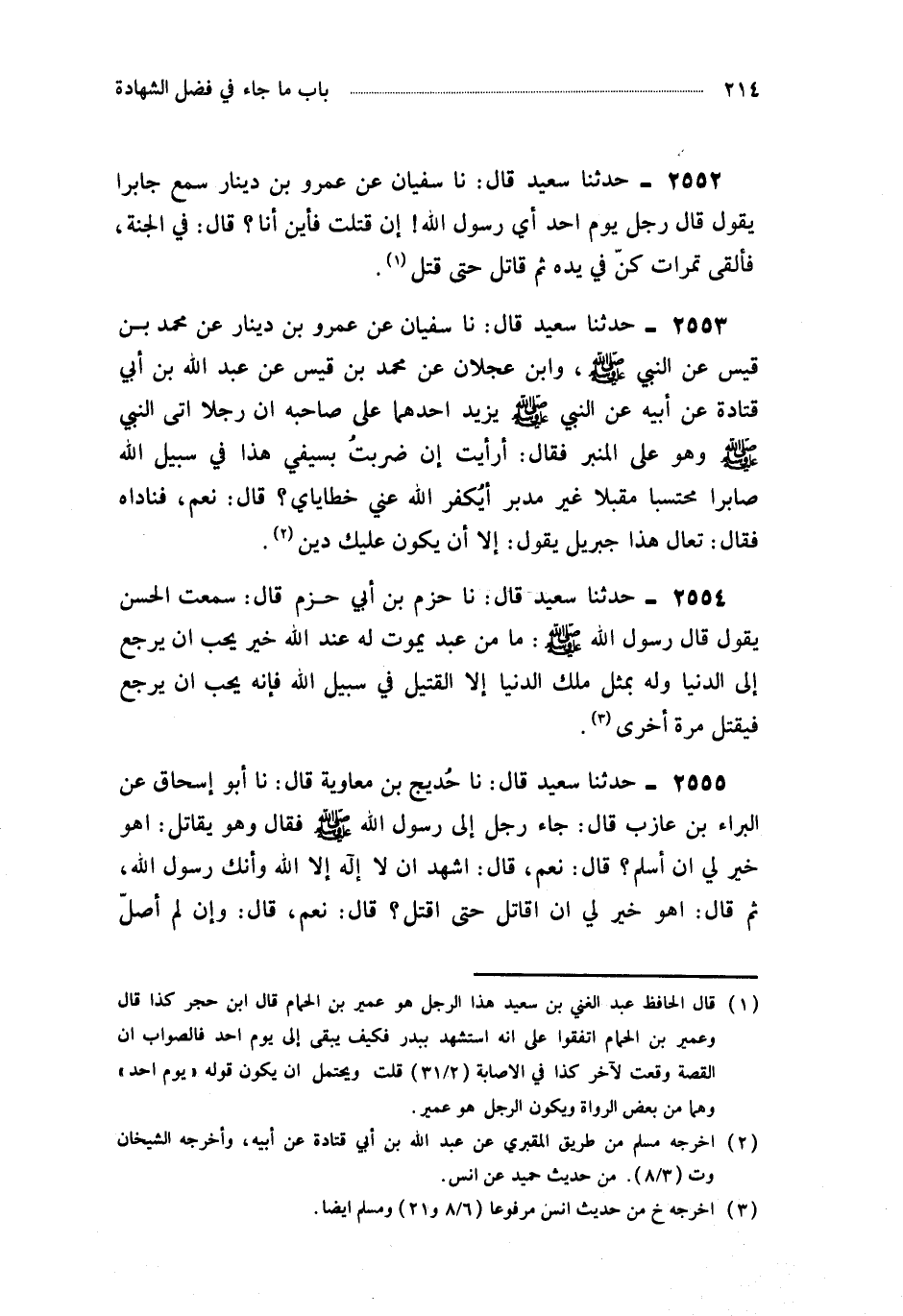 2552- حَدَّثَنَا سُفْيَانُ ، عَنْ عَمْرِو بْنِ دِينَارٍ ، سَمِعَ جَابِرًا ، يَقُولُ : قَالَ رَجُلٌ يَوْمَ أُحُدٍ أَيْ رَسُولَ اللهِ إِنْ قُتِلْتُ فَأَيْنَ أَنَا ؟ قَالَ : فِي الْجَنَّةِ فَأَلْقَى تَمَرَاتٍ كُنَّ فِي يَدِهِ ، ثُمَّ قَاتَلَ حَتَّى قُتِلَ.