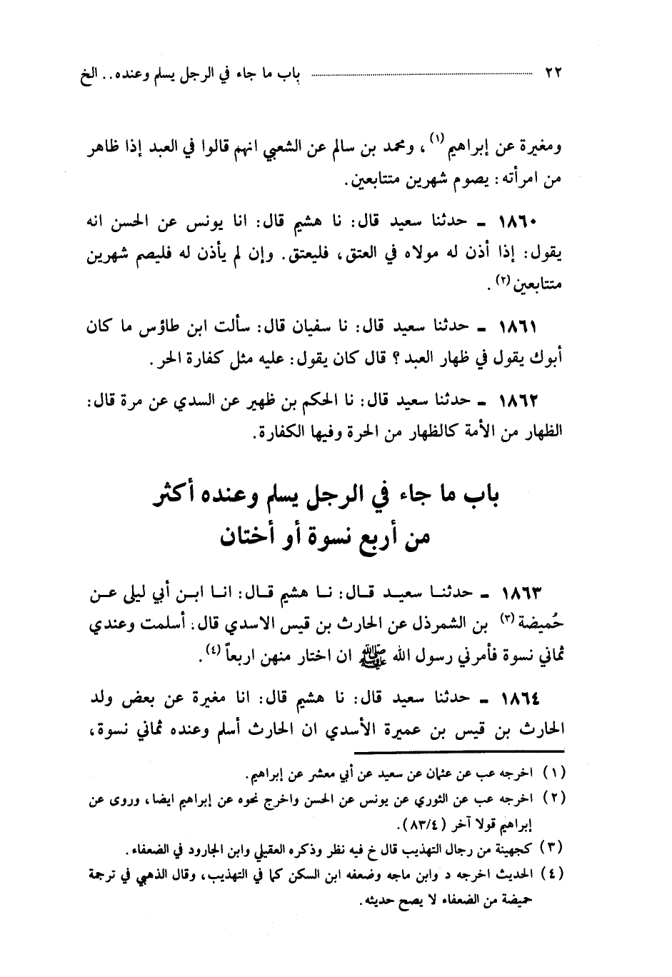 1864- حَدَّثَنَا هُشَيْمٌ ، قَالَ : أَخْبَرَنَا مُغِيرَةُ ، عَنْ بَعْضِ وَلَدِ الْحَارِثِ بْنِ قَيْسِ بْنِ عَمِيرَةَ الأَسَدِيِّ أَنَّ الْحَارِثَ أَسْلَمَ وَعِنْدَهُ ثَمَانِي نِسْوَةٍ ، فَذَكَرَ ذَلِكَ لِرَسُولِ اللهِ صَلَّى اللَّهُ عَلَيْهِ وَسَلَّمَ ، فَقَالَ لَهُ : اخْتَرْ مِنْهُنَّ أَرْبَعًا.