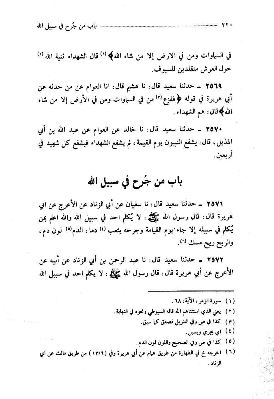 2571- حَدَّثَنَا سُفْيَانُ ، عَنْ أَبِي الزِّنَادِ ، عَنِ الأَعْرَجِ ، عَنْ أَبِي هُرَيْرَةَ ، قَالَ : قَالَ رَسُولُ اللهِ صَلَّى اللَّهُ عَلَيْهِ وَسَلَّمَ : لاَ يُكْلَمُ أَحَدٌ فِي سَبِيلِ اللهِ وَاللَّهُ أَعْلَمُ بِمَنْ يُكْلَمُ فِي سَبِيلِهِ إِلاَّ جَاءَ يَوْمَ الْقِيَامَةِ وَجُرْحُهُ يَثْعَبُ دَمًا ، الدَّمُ لَوْنُ دَمٍ ، وَالرِّيحُ رِيحُ مِسْكٍ.