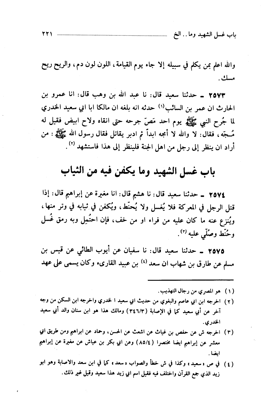 2575- حَدَّثَنَا سُفْيَانُ ، عَنْ أَيُّوبَ الطَّائِيِّ ، عَنْ قَيْسِ بْنِ مُسْلِمٍ ، عَنْ طَارِقِ بْنِ شِهَابٍ ، أَنَّ سَعْدَ بْنَ عُبَيْدٍ الْقَارِئَ - وَكَانَ يُسَمَّى عَلَى عَهْدِ النَّبِيِّ صَلَّى اللَّهُ عَلَيْهِ وَسَلَّمَ الْقَارِئَ - قُتِلَ يَوْمَ الْقَادِسِيَّةِ وَكَانَ قَالَ لَهُمْ : لاَ تُغَسِّلُوا عَنِّي دَمًا ، وَلاَ تَنْزِعُوا عَنِّي ثَوْبًا إِلاَّ جِلْدًا.